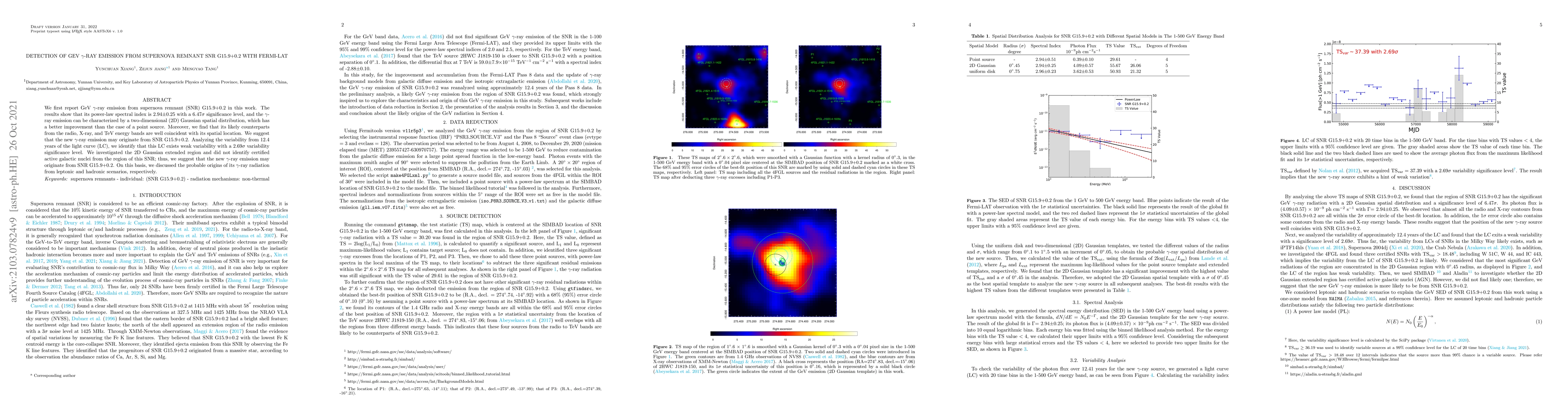 We first report GeV $\gamma$-ray emission from supernova remnant (SNR) G15.9+0.2 in this work. The results show that its power-law spectral index is 2.94$\pm$0.25 with a 6.47$\sigma$ significance level, and the $\gamma$-ray emission can be characterized by a two-dimensional (2D) Gaussian spatial distribution, which has a better improvement than the case of a point source. Moreover, we find that its likely counterparts from the radio, X-ray, and TeV energy bands are well coincident with its spatial location. We suggest that the new $\gamma$-ray emission may originate from SNR G15.9+0.2. Analyzing the variability from 12.4 years of the light curve (LC), we identify that this LC exists weak variability with a 2.69$\sigma$ variability significance level. We investigated the 2D Gaussian extended region and did not identify certified active galactic nuclei from the region of this SNR; thus, we suggest that the new $\gamma$-ray emission may originate from SNR G15.9+0.2. On this basis, we discussed the probable origins of its $\gamma$-ray radiation from leptonic and hadronic scenarios, respectively.