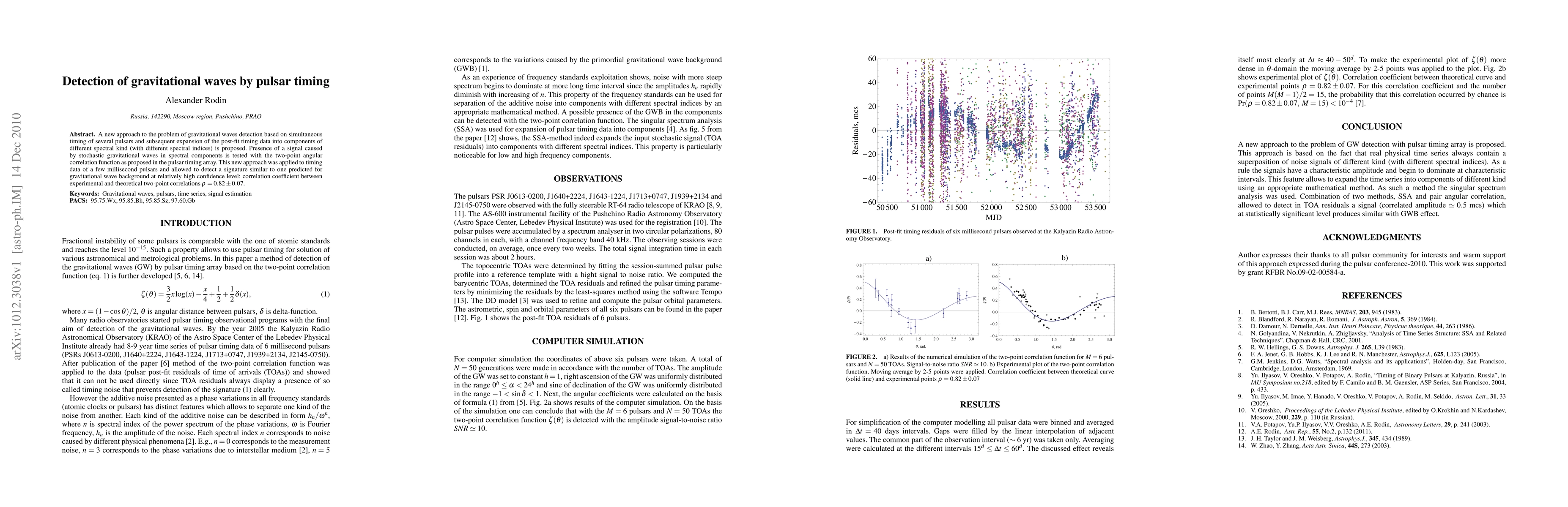 The paper introduces a new technique for gravitational wave detection using pulsar timing arrays, incorporating singular spectrum analysis for separating noise into components with different spectral indices.