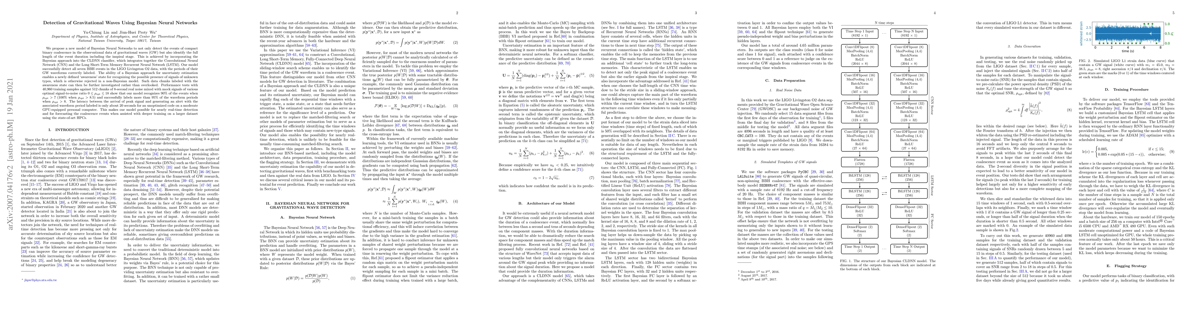We propose a new model of Bayesian Neural Networks to not only detect the events of compact binary coalescence in the observational data of gravitational waves (GW) but also identify the full length of the event duration including the inspiral stage. This is achieved by incorporating the Bayesian approach into the CLDNN classifier, which integrates together the Convolutional Neural Network (CNN) and the Long Short-Term Memory Recurrent Neural Network (LSTM). Our model successfully detect all seven BBH events in the LIGO Livingston O2 data, with the periods of their GW waveforms correctly labeled. The ability of a Bayesian approach for uncertainty estimation enables a newly defined `awareness' state for recognizing the possible presence of signals of unknown types, which is otherwise rejected in a non-Bayesian model. Such data chunks labeled with the awareness state can then be further investigated rather than overlooked. Performance tests with 40,960 training samples against 512 chunks of 8-second real noise mixed with mock signals of various optimal signal-to-noise ratio $0 \leq \rho_\text{opt} \leq 18$ show that our model recognizes 90% of the events when $\rho_\text{opt} >7$ (100% when $\rho_\text{opt} >8.5$) and successfully labels more than 95% of the waveform periods when $\rho_\text{opt} >8$. The latency between the arrival of peak signal and generating an alert with the associated waveform period labeled is only about 20 seconds for an unoptimized code on a moderate GPU-equipped personal computer. This makes our model possible for nearly real-time detection and for forecasting the coalescence events when assisted with deeper training on a larger dataset using the state-of-art HPCs.