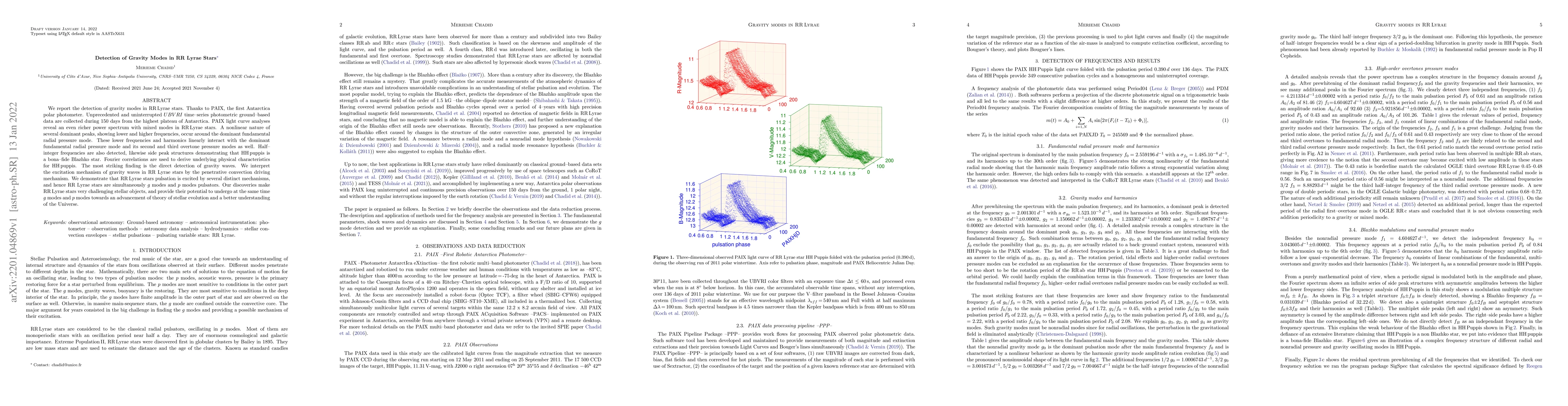 We report the detection of gravity modes in RR Lyrae stars. Thanks to PAIX, the first Antarctica polar photometer. Unprecedented and uninterrupted U BV RI time-series photometric ground-based data are collected during 150 days from the highest plateau of Antarctica. PAIX light curve analyses reveal an even richer power spectrum with mixed modes in RR Lyrae stars. A nonlinear nature of several dominant peaks, showing lower and higher frequencies, occur around the dominant fundamental radial pressure mode. These lower frequencies and harmonics linearly interact with the dominant fundamental radial pressure mode and its second and third overtone pressure modes as well. Half-integer frequencies are also detected, likewise side peak structures demonstrating that HH puppis is a bona-fide Blazhko star. Fourier correlations are used to derive underlying physical characteristics for HH puppis. The most striking finding is the direct detection of gravity waves. We interpret the excitation mechanism of gravity waves in RR Lyrae stars by the penetrative convection driving mechanism. We demonstrate that RR Lyrae stars pulsation is excited by several distinct mechanisms, and hence RR Lyrae stars are simultaneously g modes and p modes pulsators. Our discoveries make RR Lyrae stars very challenging stellar objects, and provide their potential to undergo at the same time g modes and p modes towards an advancement of theory of stellar evolution and a better understanding of the Universe.