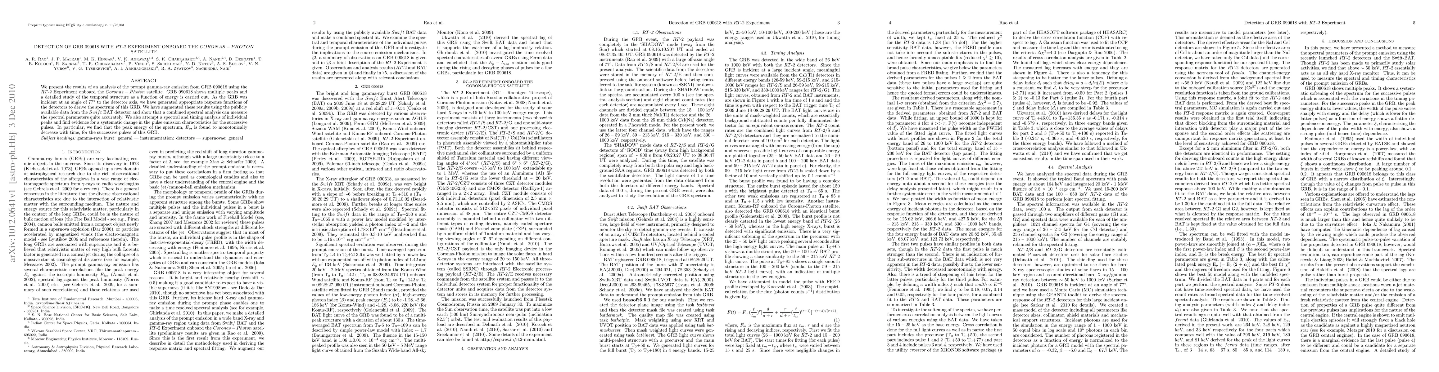 We present the results of an analysis of the prompt gamma-ray emission from GRB 090618 using the RT-2 Experiment onboard the Coronas-Photon satellite. GRB 090618 shows multiple peaks and a detailed study of the temporal structure as a function of energy is carried out. As the GRB was incident at an angle of 77 degree to the detector axis, we have generated appropriate response functions of the detectors to derive the spectrum of this GRB. We have augmented these results using the publicly available data from the Swift BAT detector and show that a combined spectral analysis can measure the spectral parameters quite accurately. We also attempt a spectral and timing analysis of individual peaks and find evidence for a systematic change in the pulse emission characteristics for the successive pulses. In particular, we find that the peak energy of the spectrum, E_p, is found to monotonically decrease with time, for the successive pulses of this GRB.
