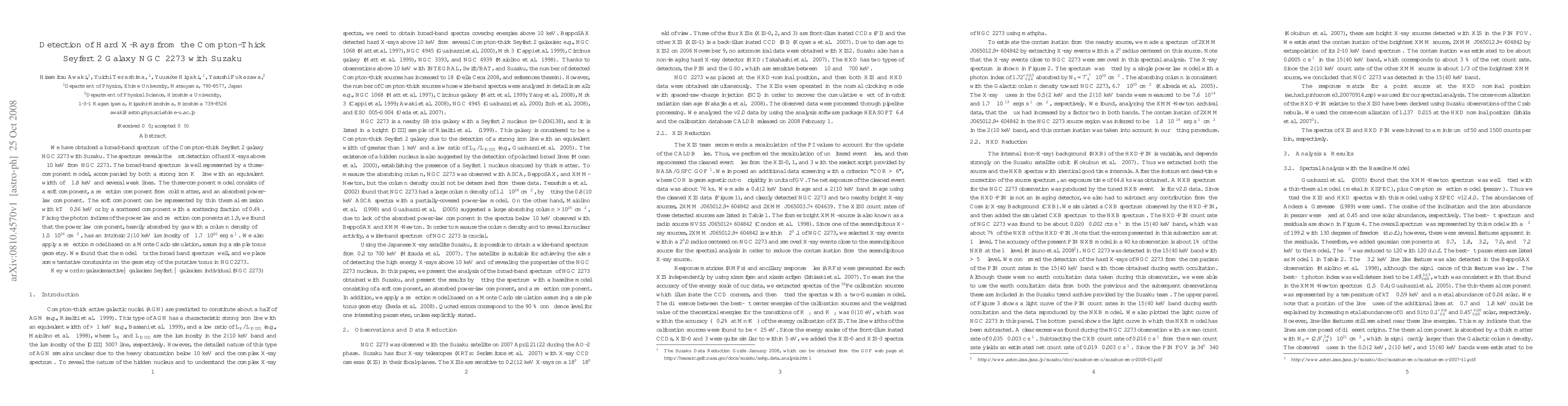 We have obtained a broad-band spectrum of the Compton-thick Seyfert 2 galaxy NGC 2273 with Suzaku. The spectrum reveals the first detection of hard X-rays above ~10 keV from NGC 2273. The broad-band spectrum is well represented by a three-component model, accompanied by both a strong iron Ka line with an equivalent width of ~ 1.8 keV and several weak lines. The three-component model consists of a soft component, a reflection component from cold matter, and an absorbed power-law component. The soft component can be represented by thin thermal emission with kT~0.56 keV or by a scattered component with a scattering fraction of 0.4%. Fixing the photon indices of the power law and reflection components at 1.9, we found that the power law component, heavily absorbed by gas with a column density of ~1.5x10^24 cm^-2, has an intrinsic 2-10 keV luminosity of ~1.7x10^42 erg/s. We also apply a reflection model based on a Monte Carlo simulation, assuming a simple torus geometry. We found that the model fits the broad band spectrum well, and we place some tentative constraints on the geometry of the putative torus in NGC2273.