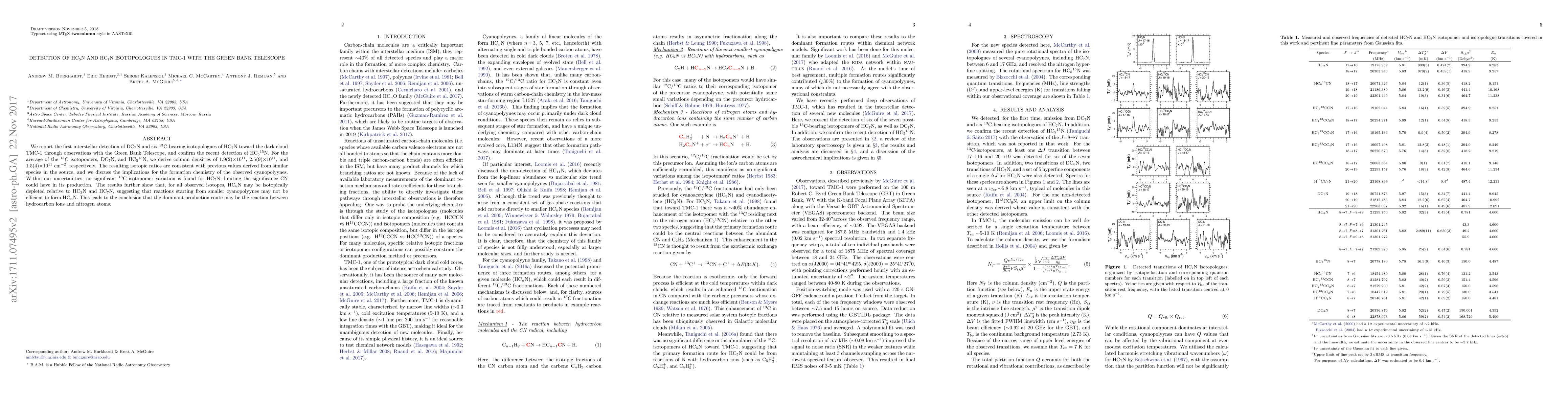 We report the first interstellar detection of DC$_7$N and six $^{13}$C-bearing isotopologues of HC$_7$N toward the dark cloud TMC-1 through observations with the Green Bank Telescope, and confirm the recent detection of HC$_5$$^{15}$N. For the average of the $^{13}$C isotopomers, DC$_7$N, and HC$_5$$^{15}$N, we derive column densities of 1.9(2)$\times$10$^{11}$, 2.5(9)$\times$10$^{11}$, and 1.5(4)$\times$10$^{11}$ cm$^{-2}$, respectively. The resulting isotopic ratios are consistent with previous values derived from similar species in the source, and we discuss the implications for the formation chemistry of the observed cyanopolyynes. Within our uncertainties, no significant $^{13}$C isotopomer variation is found for HC$_7$N, limiting the significance CN could have in its production. The results further show that, for all observed isotopes, HC$_5$N may be isotopically depleted relative to HC$_3$N and HC$_7$N, suggesting that reactions starting from smaller cyanopolyynes may not be efficient to form HC$_{n}$N. This leads to the conclusion that the dominant production route may be the reaction between hydrocarbon ions and nitrogen atoms.