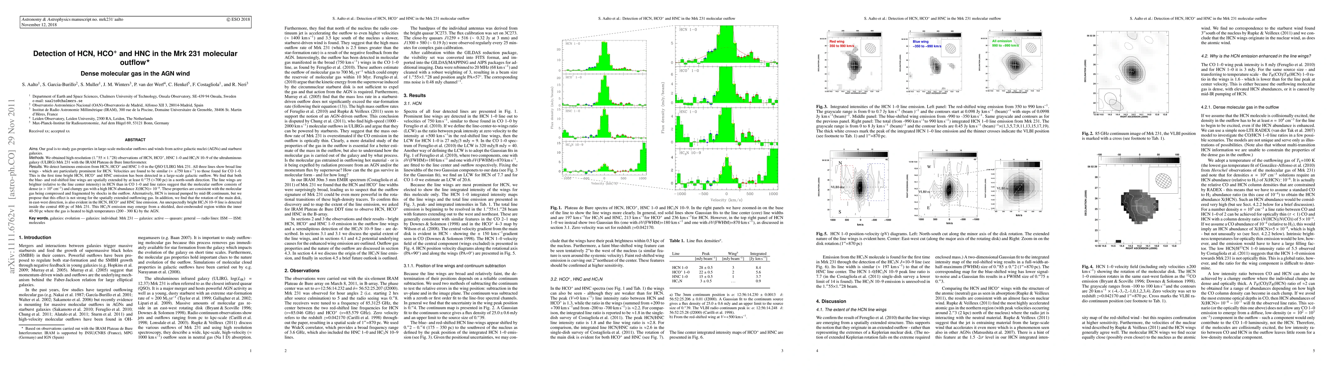 We detect luminous emission from HCN, HCO+ and HNC 1--0 in the QSO ULIRG Mrk~231 with the IRAM Plateau de Bure Interferometer at 1."55 by 1."28 resolution. All three lines show broad line wings - which are particularly prominent for HCN. Velocities are found to be similar (750 km/s) to those found for CO 1-0. This is the first time bright HCN, HCO+ and HNC emission has been detected in a large-scale galactic outflow. We find that both the blue- and red-shifted line wings are spatially extended by at least 0."75 (700 pc) in a north-south direction. The line wings are brighter (relative to the line center intensity) in HCN than in CO 1-0 and line ratios suggest that the molecular outflow consists of dense (n>10E4 cmE-3) and clumpy gas with a high HCN abundance X(HCN)>10E-8. These properties are consistent with the molecular gas being compressed and fragmented by shocks in the outflow. Alternatively, HCN is instead pumped by mid-IR continuum, but we propose that this effect is not strong for the spatially extended outflowing gas. In addition, we find that the rotation of the main disk, in east-west direction, is also evident in the HCN, HCO+ and HNC line emission. An unexpectedly bright HC3N 10-9 line is detected inside the central 400 pc of Mrk231. This HC3N emission may emerge from a shielded, dust-enshrouded region within the inner 40-50 pc where the gas is heated to high temperatures (200 - 300 K) by the AGN.