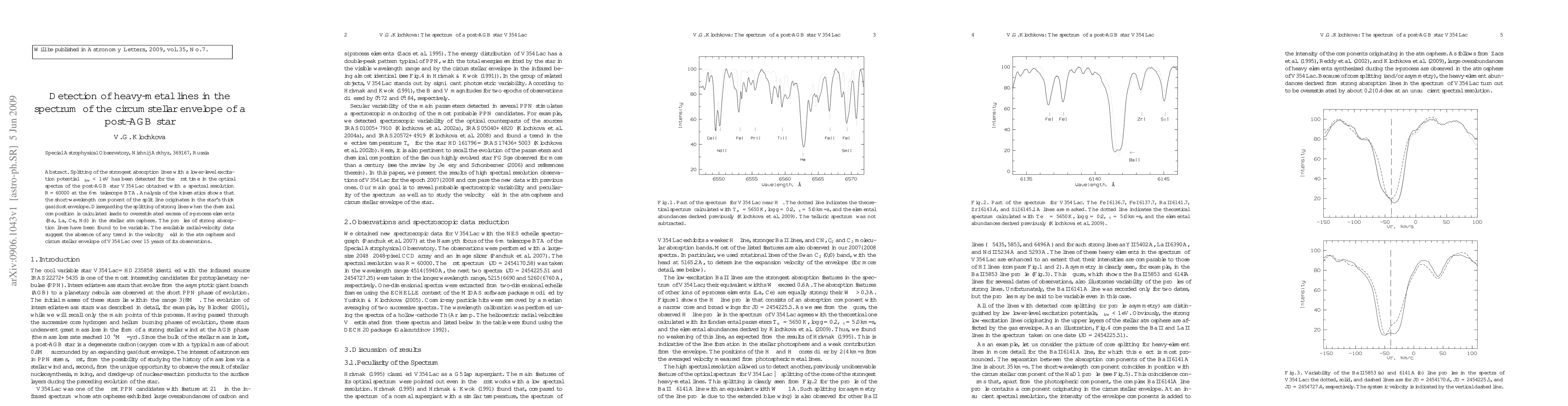Splitting of the strongest absorption lines with a lower-level excitation potential $\chi<$1eV has been detected for the first time in the optical spectra of the post-AGB star V354Lac obtained with a spectral resolution R=60000 at the 6-m telescope BTA. Analysis of the kinematics shows that the short-wavelength component of the split line originates in the star's thick gas-dust envelope. Disregarding the splitting of strong lines when the chemical composition is calculated leads to overestimated excess of s-process elements (Ba, La, Ce, Nd) in the stellar atmosphere. The profiles of strong absorption lines have been found to be variable. The available radial-velocity data suggest the absence of any trend in the velocity field in the atmosphere and circumstellar envelope of V354Lac over 15 years of its observations.