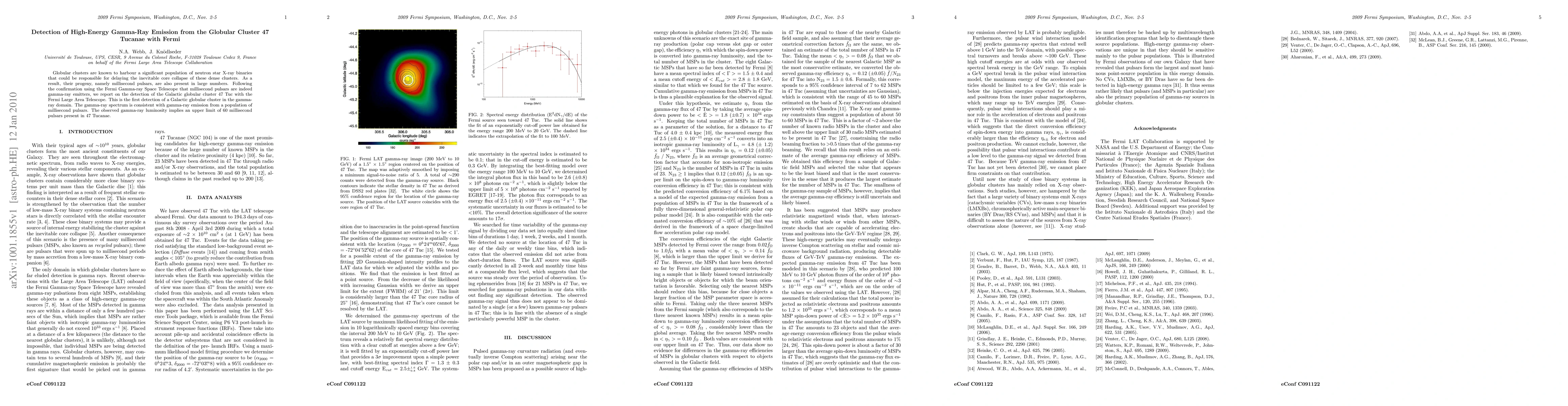 The Fermi Gamma-ray Space Telescope detected high-energy gamma-ray emission from the globular cluster 47 Tucanae, marking the first such detection of a Galactic globular cluster. The gamma-ray spectrum aligns with emission from millisecond pulsars, suggesting an upper limit of 60 millisecond pulsars in the cluster.