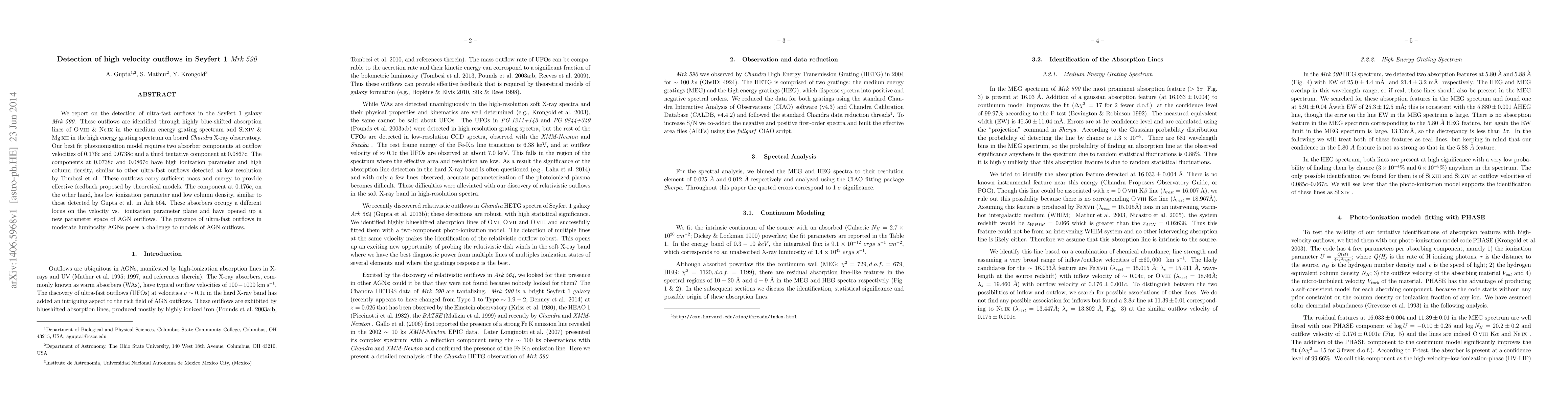 This paper reports the detection of ultra-fast outflows in the Seyfert 1 galaxy Mrk 590 using Chandra X-ray Observatory data, identifying two main outflow components at velocities of 0.176c and 0.0738c, and a tentative third component at 0.0867c. These outflows provide effective feedback and challenge existing models of AGN outflows.