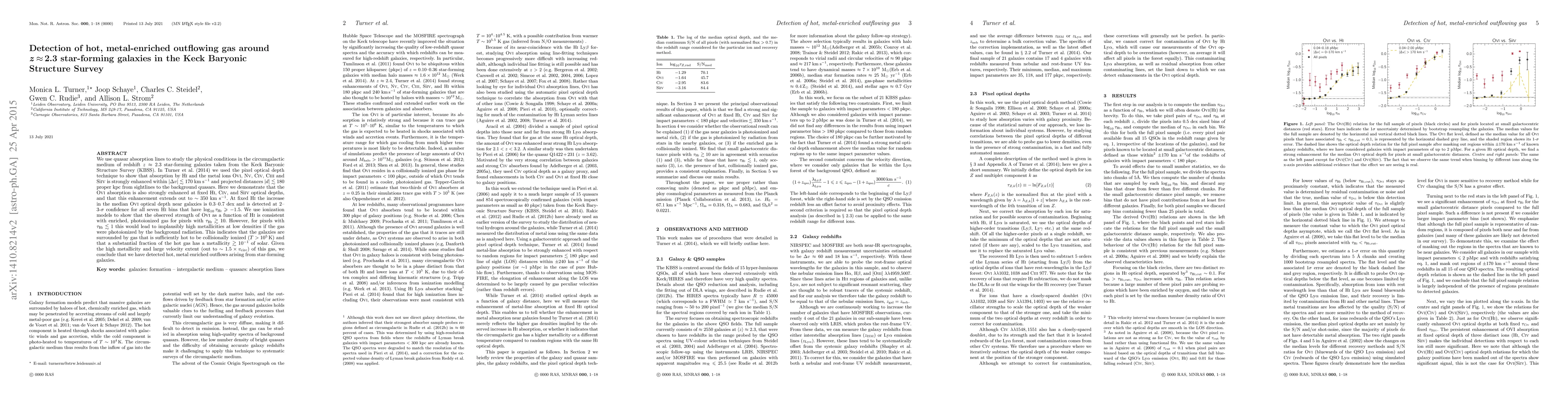 This study uses quasar absorption lines to detect hot, metal-enriched gas outflows around star-forming galaxies at $z\approx 2.3$, showing enhanced OVI absorption extending out to $\sim350$ km/s. The high metallicity and large velocity extent suggest substantial outflows from these galaxies.