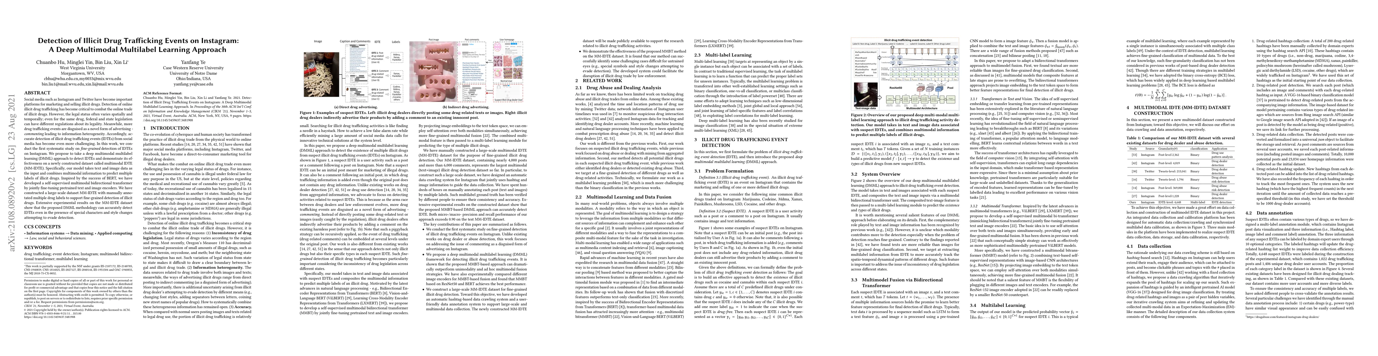 This paper proposes a deep multimodal multilabel learning approach to detect illicit drug trafficking events on Instagram, leveraging text and image data. The study introduces a self-supervised multimodal bidirectional transformer and a new dataset, MM-IDTE, demonstrating the effectiveness of the method in accurately identifying multiple drug labels despite evasion tactics.