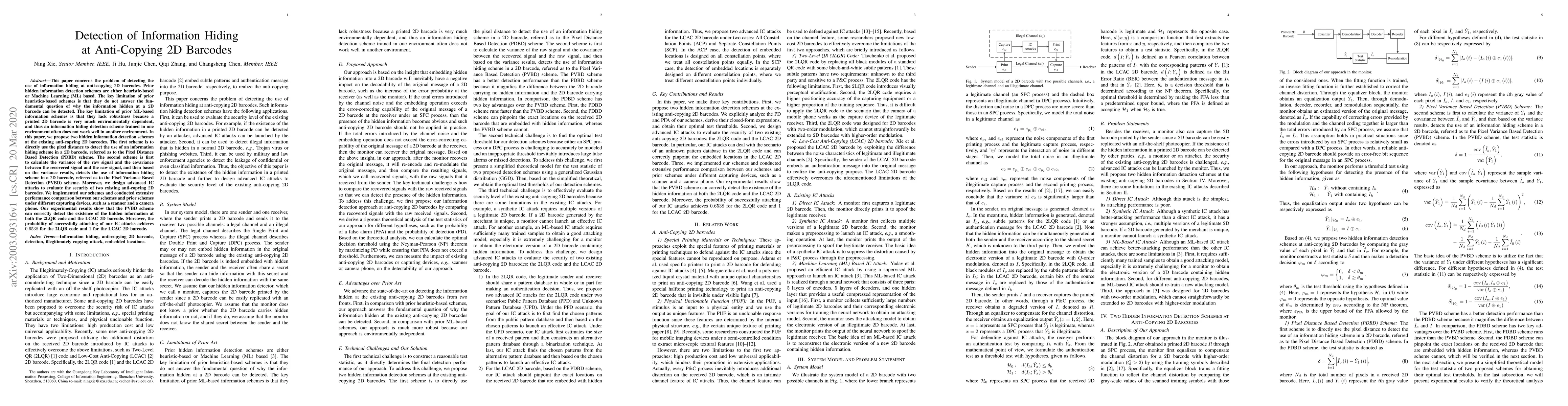 A comprehensive analysis of two existing anti-copying 2D barcodes was conducted to propose new hidden information detection schemes.