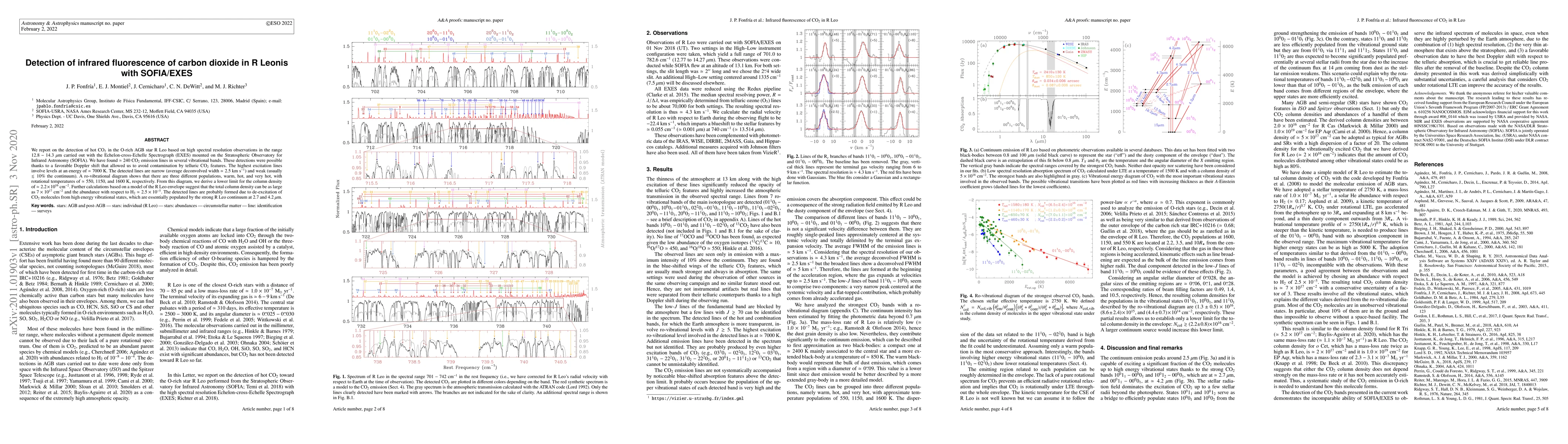 Researchers detected hot CO2 in the O-rich AGB star R Leo using SOFIA/EXES, finding ~240 emission lines in various vibrational bands. The lines indicate three temperature populations (~550, 1150, 1600 K) and a CO2 column density lower limit of ~2.2E+16 cm^{-2}. The detection suggests CO2 de-excitation by R Leo's strong continuum at 2.7 and 4.2 μm, with potential total column density of 7.0E+17 cm^{-2} and abundance ~2.5E-05 relative to H2.