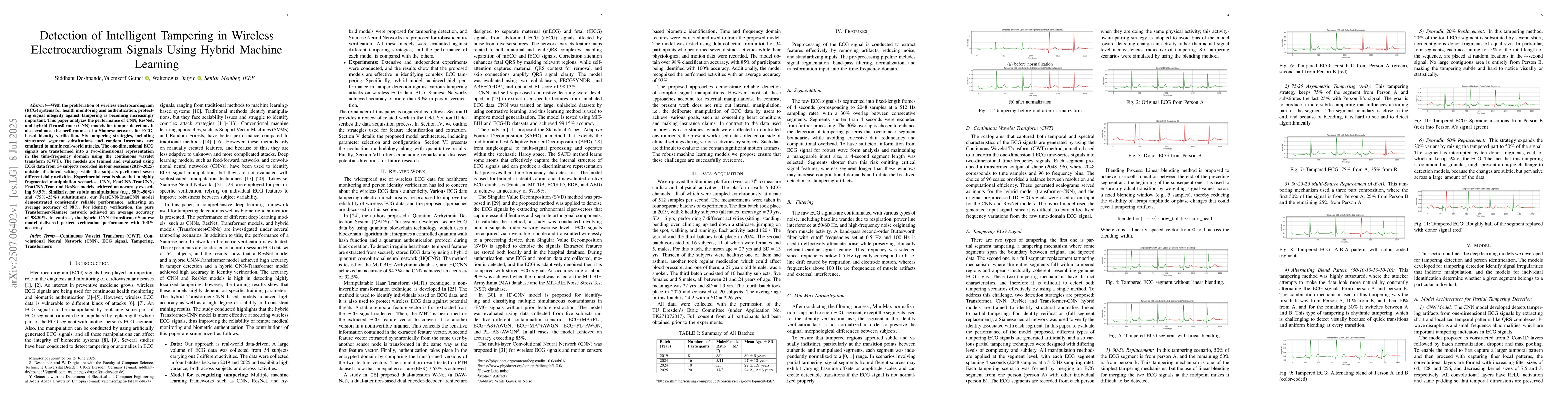 With the proliferation of wireless electrocardiogram (ECG) systems for health monitoring and authentication, protecting signal integrity against tampering is becoming increasingly important. This paper analyzes the performance of CNN, ResNet, and hybrid Transformer-CNN models for tamper detection. It also evaluates the performance of a Siamese network for ECG based identity verification. Six tampering strategies, including structured segment substitutions and random insertions, are emulated to mimic real world attacks. The one-dimensional ECG signals are transformed into a two dimensional representation in the time frequency domain using the continuous wavelet transform (CWT). The models are trained and evaluated using ECG data from 54 subjects recorded in four sessions 2019 to 2025 outside of clinical settings while the subjects performed seven different daily activities. Experimental results show that in highly fragmented manipulation scenarios, CNN, FeatCNN-TranCNN, FeatCNN-Tran and ResNet models achieved an accuracy exceeding 99.5 percent . Similarly, for subtle manipulations (for example, 50 percent from A and 50 percent from B and, 75 percent from A and 25 percent from B substitutions) our FeatCNN-TranCNN model demonstrated consistently reliable performance, achieving an average accuracy of 98 percent . For identity verification, the pure Transformer-Siamese network achieved an average accuracy of 98.30 percent . In contrast, the hybrid CNN-Transformer Siamese model delivered perfect verification performance with 100 percent accuracy.