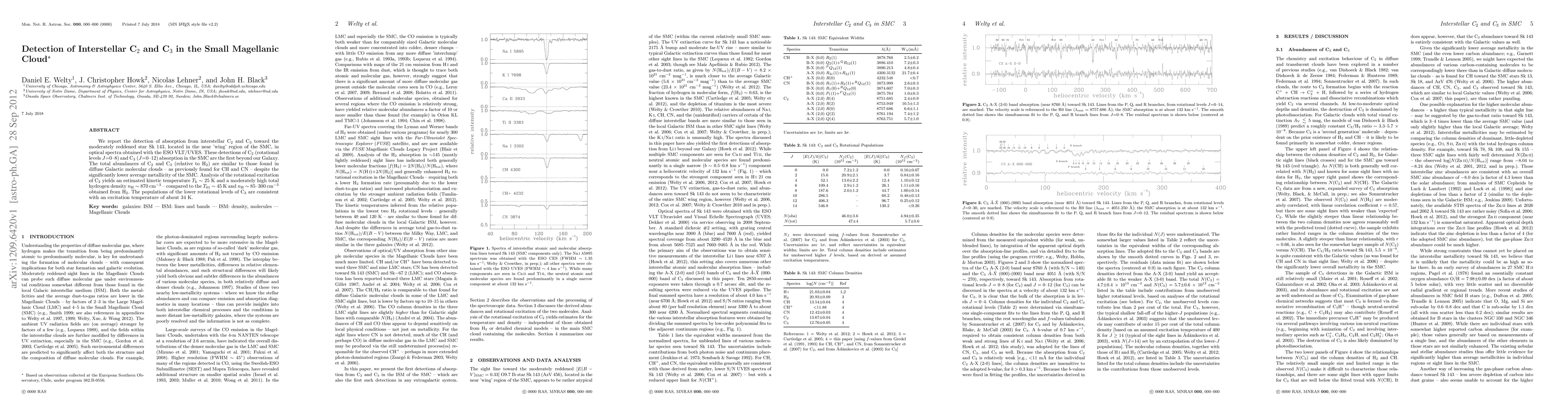 This paper reports the first detection of interstellar C_2 and C_3 in the Small Magellanic Cloud (SMC) using ESO VLT/UVES spectra, revealing similar abundances to those in diffuse Galactic molecular clouds despite lower SMC metallicity. The analysis suggests a kinetic temperature of ~25 K and a hydrogen density of ~870 cm^-3 for C_2.