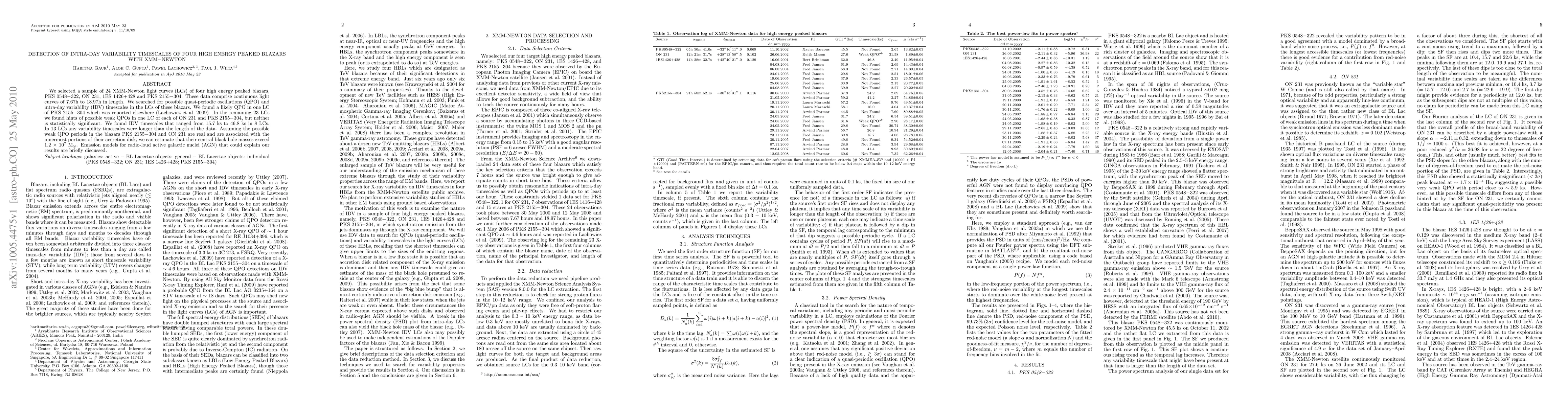 We selected a sample of 24 XMM-Newton light curves (LCs) of four high energy peaked blazars, PKS 0548-322, ON 231, 1ES 1426+428 and PKS 2155-304. These data comprise continuous light curves of 7.67h to 18.97h in length. We searched for possible quasi-periodic oscillations (QPO) and intra-day variability (IDV) timescales in the LCs of these blazars. We found a likely QPO in one LC of PKS 2155-304 which was reported elsewhere (Lachowicz et al. 2009). In the remaining 23 LCs we found hints of possible weak QPOs in one LC of each of ON 231 and PKS 2155-304, but neither is statistically significant. We found IDV timescales that ranged from 15.7 ks to 46.8 ks in 8 LCs. In 13 LCs any variability timescales were longer than the length of the data. Assuming the possible weak QPO periods in the blazars PKS 2155-304 and ON 231 are real and are associated with the innermost portions of their accretion disk, we can estimate that their central black hole masses exceed 1.2 $\times$ 10$^{7}$ M$_{\odot}$. Emission models for radio-loud active galactic nuclei (AGN) that could explain our results are briefly discussed.