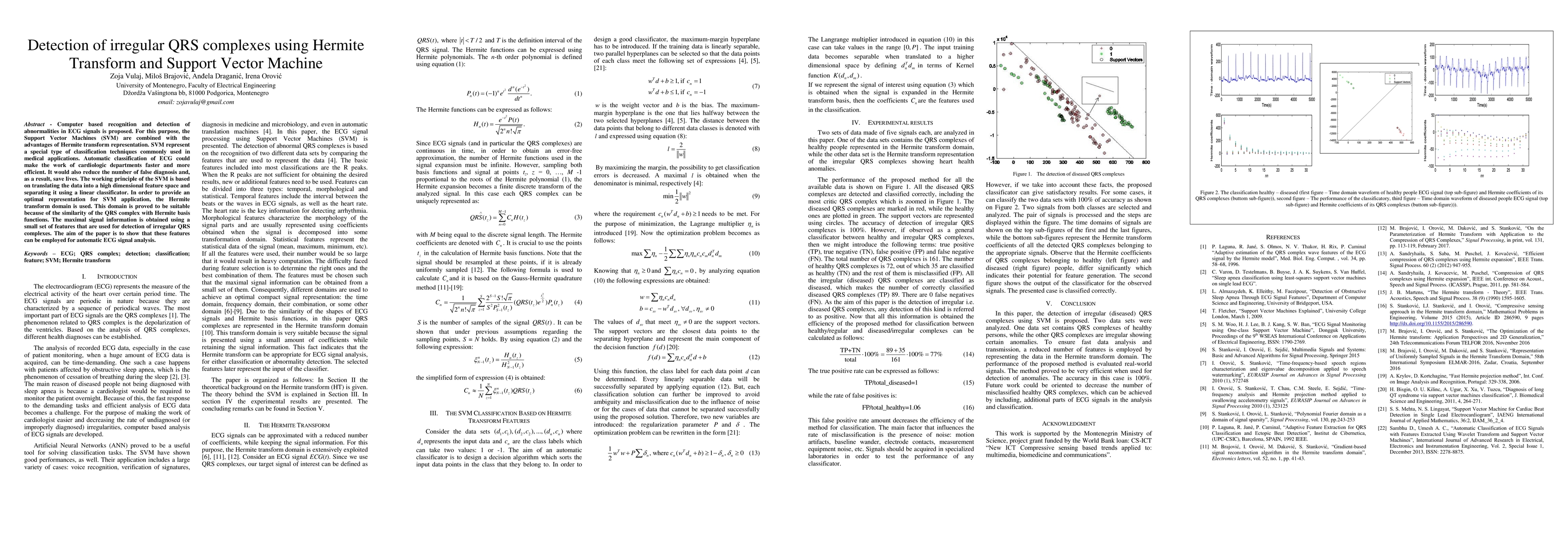 Computer based recognition and detection of abnormalities in ECG signals is proposed. For this purpose, the Support Vector Machines (SVM) are combined with the advantages of Hermite transform representation. SVM represent a special type of classification techniques commonly used in medical applications. Automatic classification of ECG could make the work of cardiologic departments faster and more efficient. It would also reduce the number of false diagnosis and, as a result, save lives. The working principle of the SVM is based on translating the data into a high dimensional feature space and separating it using a linear classificator. In order to provide an optimal representation for SVM application, the Hermite transform domain is used. This domain is proved to be suitable because of the similarity of the QRS complex with Hermite basis functions. The maximal signal information is obtained using a small set of features that are used for detection of irregular QRS complexes. The aim of the paper is to show that these features can be employed for automatic ECG signal analysis.