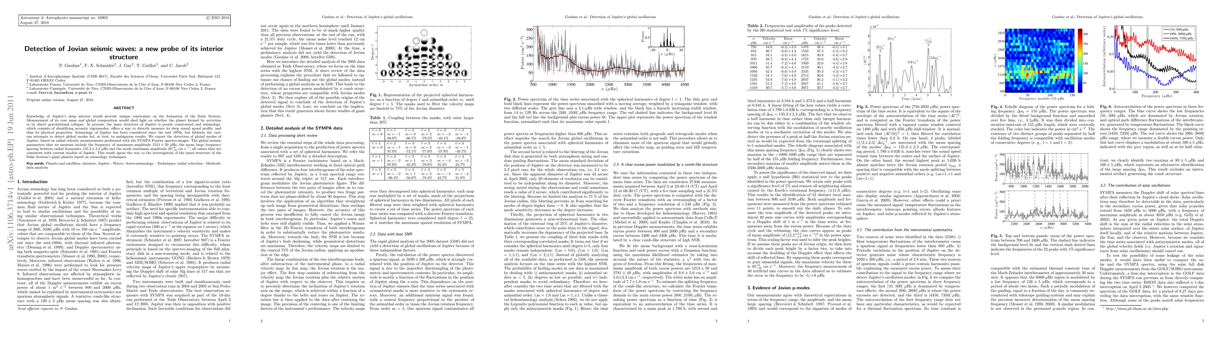 Knowledge of Jupiter's deep interior would provide unique constraints on the formation of the Solar System. Measurement of its core mass and global composition would shed light on whether the planet formed by accretion or by direct gravitational collapse. At present, the inner structure of Jupiter is poorly constrained and seismology, which consists of identifying acoustic eigenmodes, offers a way to directly measure its deep sound speed profile, and thus its physical properties. Seismology of Jupiter has been considered since the mid 1970s, but hitherto the various attempts to detect global modes led, at best, to ambiguous results. We report the detection of global modes of Jupiter, based on radial velocity measurements performed with the SYMPA Fourier spectro-imager. The global seismic parameters that we measure include the frequency of maximum amplitude 1213+/-50 \mu Hz, the mean large frequency spacing between radial harmonics 155.3+/-2.2 \mu Hz and the mode maximum amplitude 49 (-10/+8) cm/s, all values that are consistent with current models of Jupiter. This result opens the way to the investigation of the inner structure of the Solar System's giant planets based on seismology techniques.