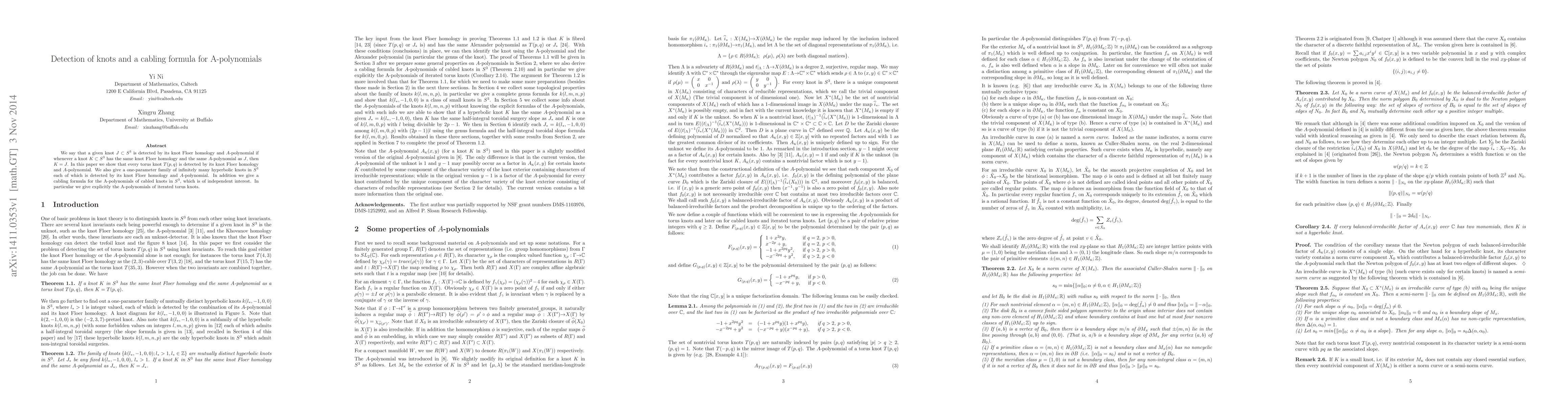 This paper demonstrates that certain torus and hyperbolic knots are uniquely identified by their knot Floer homology and $A$-polynomials. It also presents a cabling formula for the $A$-polynomials of cabled knots, specifically for iterated torus knots.