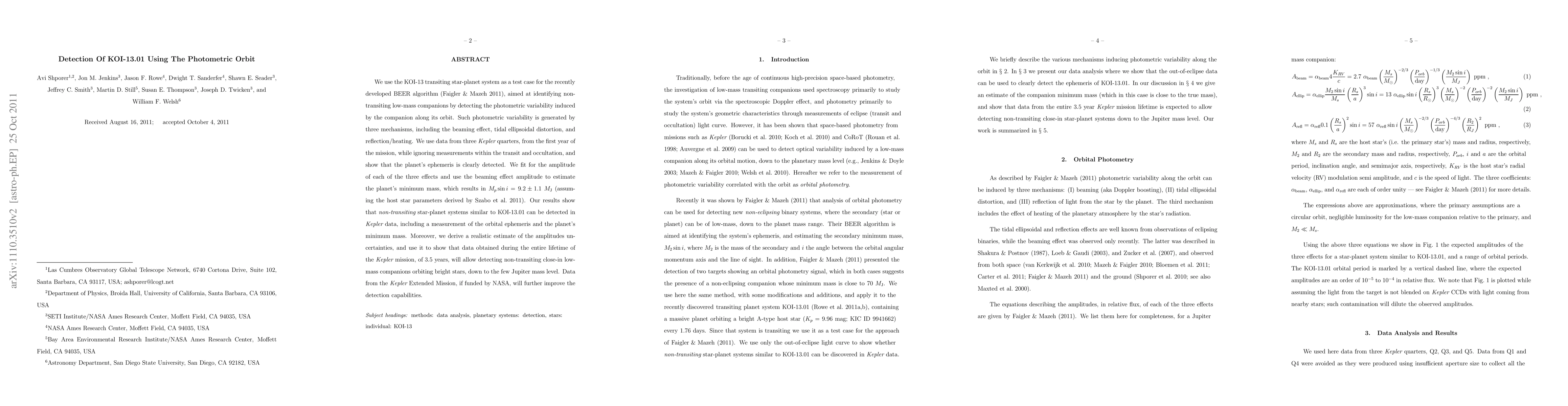 This study uses the KOI-13.01 transiting star-planet system to test the BEER algorithm for detecting non-transiting low-mass companions via photometric variability. The planet's ephemeris is detected, and its minimum mass is estimated at 9.2 +/- 1.1 M_J, demonstrating the potential for detecting similar systems in Kepler data.