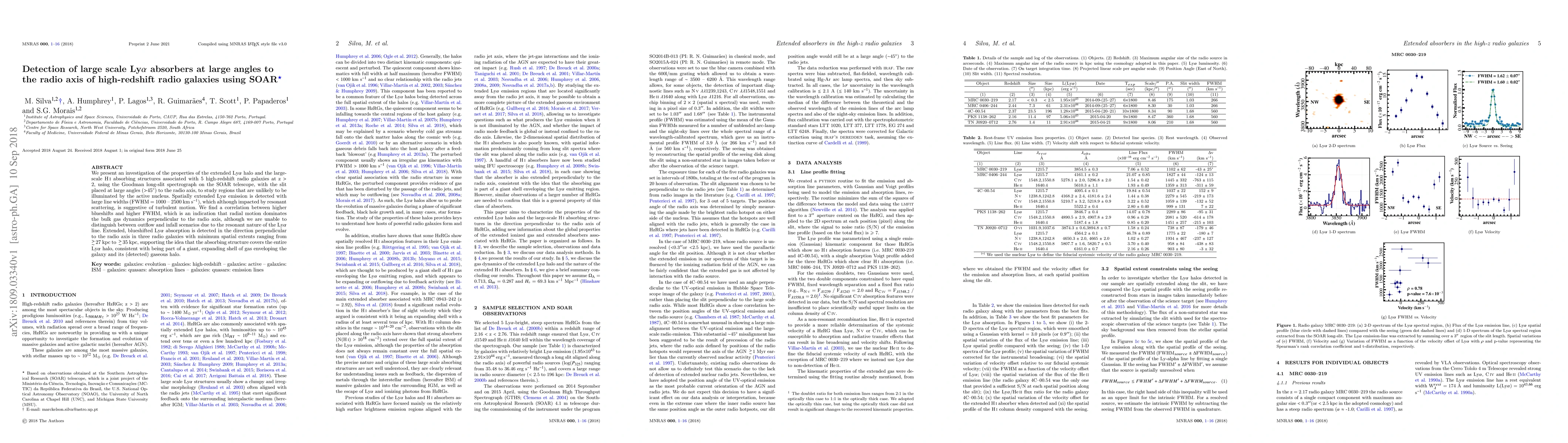 We present an investigation of the properties of the extended Ly$\alpha$ halo and the large-scale \ion{H}{I} absorbing structures associated with 5 high-redshift radio galaxies at z $>$ 2, using the Goodman long-slit spectrograph on the SOAR telescope, with the slit placed at large angles ($>$45$^{\circ}$) to the radio axis, to study regions that are unlikely to be illuminated by the active nucleus. Spatially extended Ly$\alpha$ emission is detected with large line widths (FWHM = 1000 -- 2500 km s$^{-1}$), which although impacted by resonant scattering, is suggestive of turbulent motion. We find a correlation between higher blueshifts and higher FWHM, which is an indication that radial motion dominates the bulk gas dynamics perpendicular to the radio axis, although we are unable to distinguish between outflow and infall scenarios due to the resonant nature of the Ly$\alpha$ line. Extended, blueshifted Ly$\alpha$ absorption is detected in the direction perpendicular to the radio axis in three radio galaxies with minimum spatial extents ranging from $\gtrsim$27 kpc to $\gtrsim$35 kpc, supporting the idea that the absorbing structure covers the entire Ly$\alpha$ halo, consistent with being part of a giant, expanding shell of gas enveloping the galaxy and its (detected) gaseous halo.