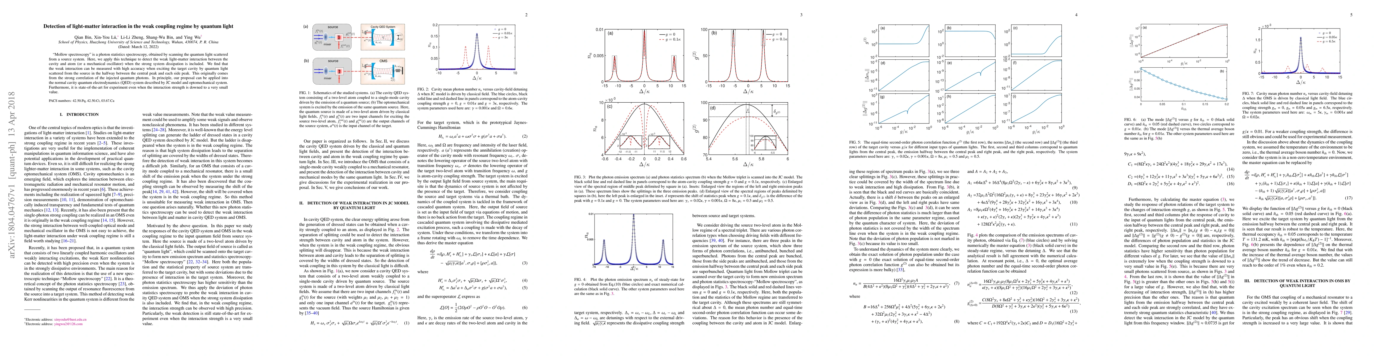 Mollow spectroscopy is a photon statistics spectroscopy, obtained by scanning the quantum light scattered from a source system. Here, we apply this technique to detect the weak light-matter interaction between the cavity and atom (or a mechanical oscillator) when the strong system dissipation is included. We find that the weak interaction can be measured with high accuracy when exciting the target cavity by quantum light scattered from the source in the halfway between the central peak and each side peak. This originally comes from the strong correlation of the injected quantum photons. In principle, our proposal can be applied into the normal cavity quantum electrodynamics (QED) system described by JC model and optomechanical system. Furthermore, it is state-of-the-art for experiment even when the interaction strength is downed to a very small value.