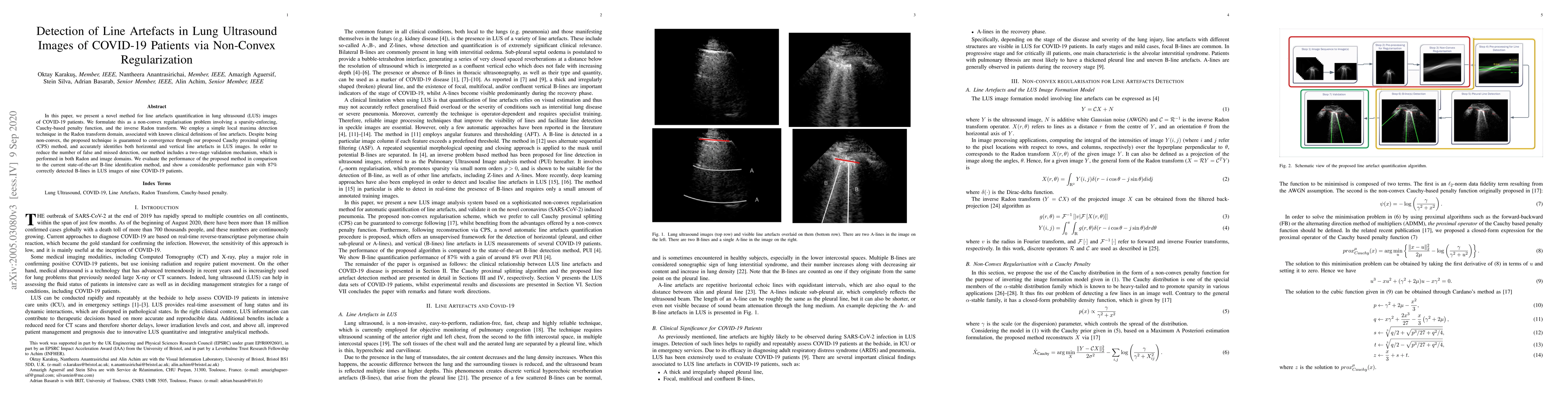 This paper introduces a novel method for detecting line artefacts in lung ultrasound images of COVID-19 patients using non-convex regularization and a Cauchy proximal splitting technique, achieving 87% accuracy in B-line identification compared to the current best methods. The method includes a two-stage validation mechanism to minimize false detections and is efficient for processing image sequences.