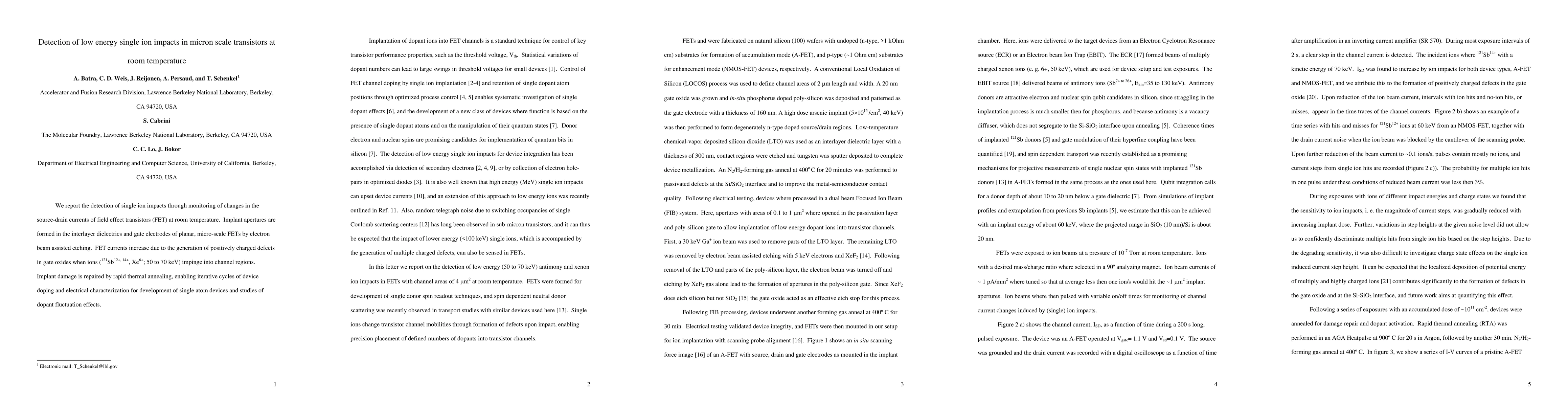 We report the detection of single ion impacts through monitoring of changes in the source-drain currents of field effect transistors (FET) at room temperature. Implant apertures are formed in the interlayer dielectrics and gate electrodes of planar, micro-scale FETs by electron beam assisted etching. FET currents increase due to the generation of positively charged defects in gate oxides when ions (121Sb12+, 14+, Xe6+; 50 to 70 keV) impinge into channel regions. Implant damage is repaired by rapid thermal annealing, enabling iterative cycles of device doping and electrical characterization for development of single atom devices and studies of dopant fluctuation effects.