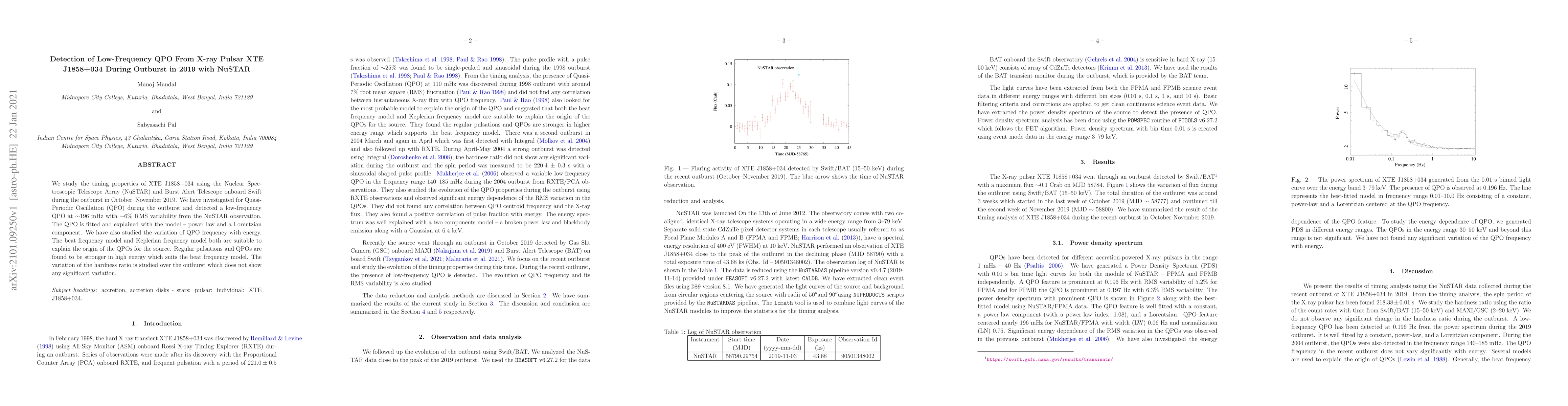 Researchers detected a low-frequency Quasi-Periodic Oscillation (QPO) in XTE J1858+034 during its 2019 outburst using NuSTAR telescope. The QPO was found to be powered by the source's regular pulsations and had a frequency of around 196 mHz.