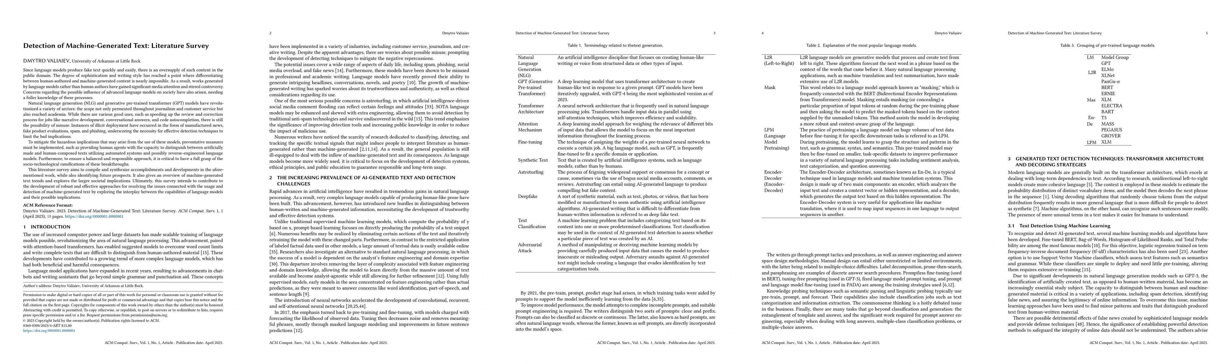 Since language models produce fake text quickly and easily, there is an oversupply of such content in the public domain. The degree of sophistication and writing style has reached a point where differentiating between human authored and machine-generated content is nearly impossible. As a result, works generated by language models rather than human authors have gained significant media attention and stirred controversy.Concerns regarding the possible influence of advanced language models on society have also arisen, needing a fuller knowledge of these processes. Natural language generation (NLG) and generative pre-trained transformer (GPT) models have revolutionized a variety of sectors: the scope not only permeated throughout journalism and customer service but also reached academia. To mitigate the hazardous implications that may arise from the use of these models, preventative measures must be implemented, such as providing human agents with the capacity to distinguish between artificially made and human composed texts utilizing automated systems and possibly reverse-engineered language models. Furthermore, to ensure a balanced and responsible approach, it is critical to have a full grasp of the socio-technological ramifications of these breakthroughs. This literature survey aims to compile and synthesize accomplishments and developments in the aforementioned work, while also identifying future prospects. It also gives an overview of machine-generated text trends and explores the larger societal implications. Ultimately, this survey intends to contribute to the development of robust and effective approaches for resolving the issues connected with the usage and detection of machine-generated text by exploring the interplay between the capabilities of language models and their possible implications.