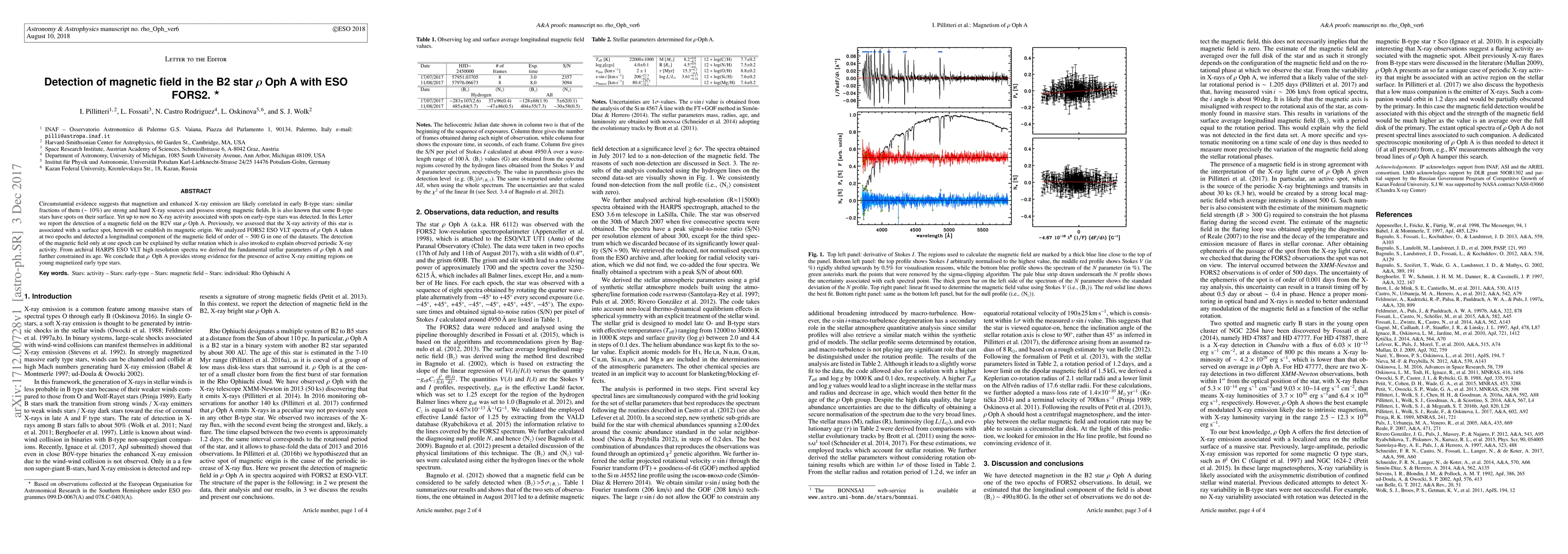 This research reports the detection of a magnetic field in the B2 star $\rho$ Oph A using ESO FORS2 spectra, revealing a longitudinal component of $\sim500$ G. The magnetic field's presence correlates with observed X-ray activity, suggesting active X-ray emitting regions on young, magnetized early-type stars.
