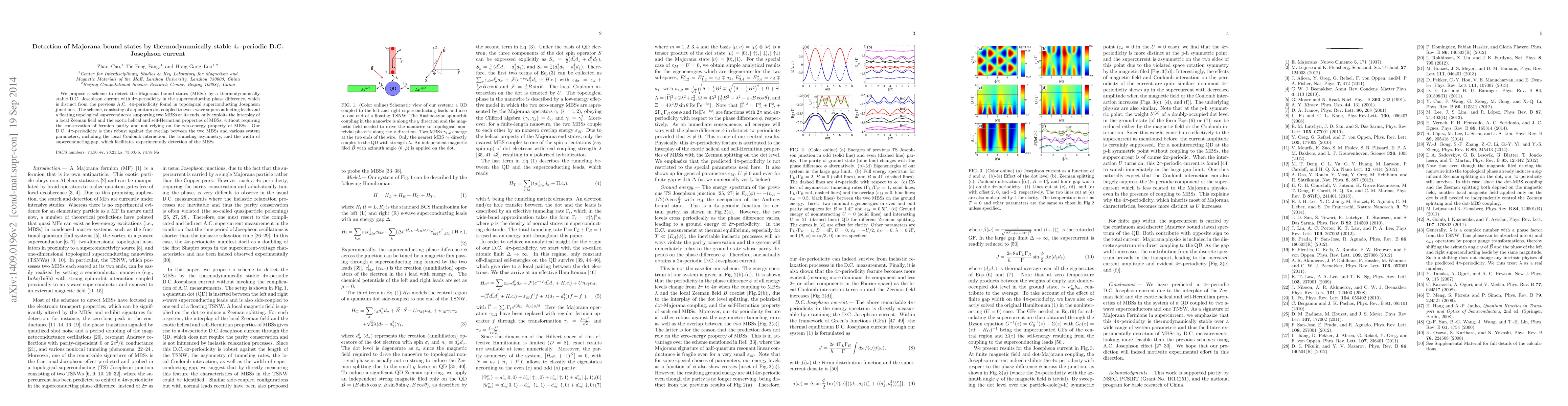 We propose a scheme to detect the Majorana bound states (MBSs) by a thermodynamically stable D.C. Josephson current with $4\pi$-periodicity in the superconducting phase difference, which is distinct from the previous A.C. $4\pi$-periodicity found in topological superconducting Josephson junctions. The scheme, consisting of a quantum dot coupled to two s-wave superconducting leads and a floating topological superconductor supporting two MBSs at its ends, only exploits the interplay of a local Zeeman field and the exotic helical and self-Hermitian properties of MBSs, without requiring the conservation of fermion parity and not relying on the zero-energy property of MBSs. Our D.C. $4\pi$-periodicity is thus robust against the overlap between the two MBSs and various system parameters, including the local Coulomb interaction, the tunneling asymmetry, and the width of superconducting gap, which facilitates experimentally detection of the MBSs.