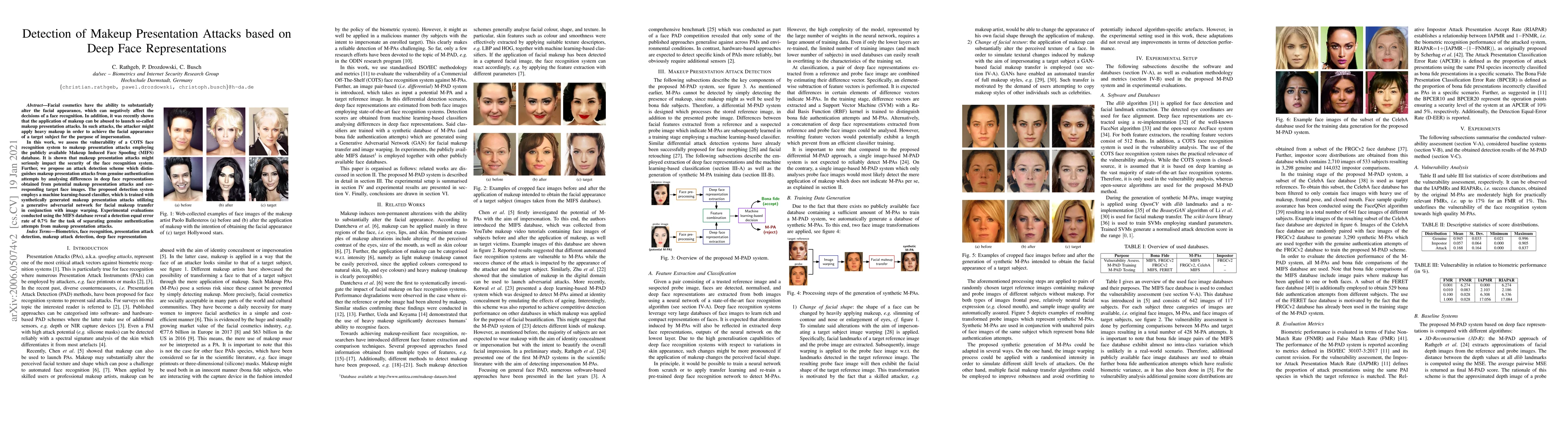 This paper investigates the vulnerability of face recognition systems to makeup presentation attacks, where makeup is used for impersonation. It proposes a detection scheme based on deep face representations and a machine learning classifier, achieving a 0.7% equal error rate in distinguishing between genuine attempts and makeup attacks using the MIFS database.