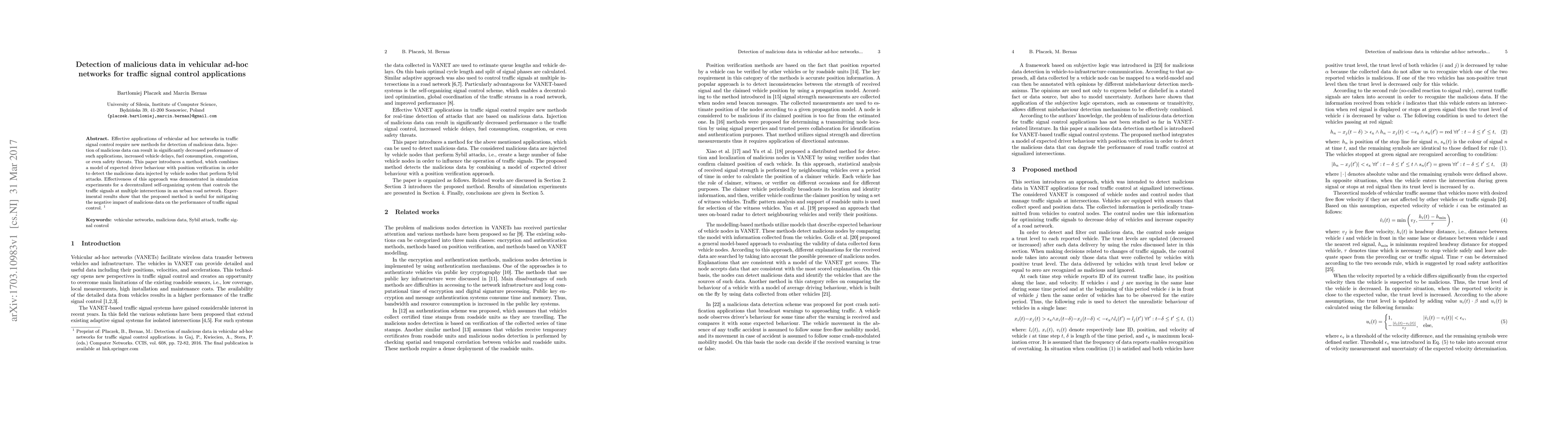 This paper proposes a method combining expected driver behavior and position verification to detect malicious data in vehicular ad-hoc networks for traffic signal control. Simulation results show that this approach effectively mitigates the negative impact of Sybil attacks on traffic signal performance.