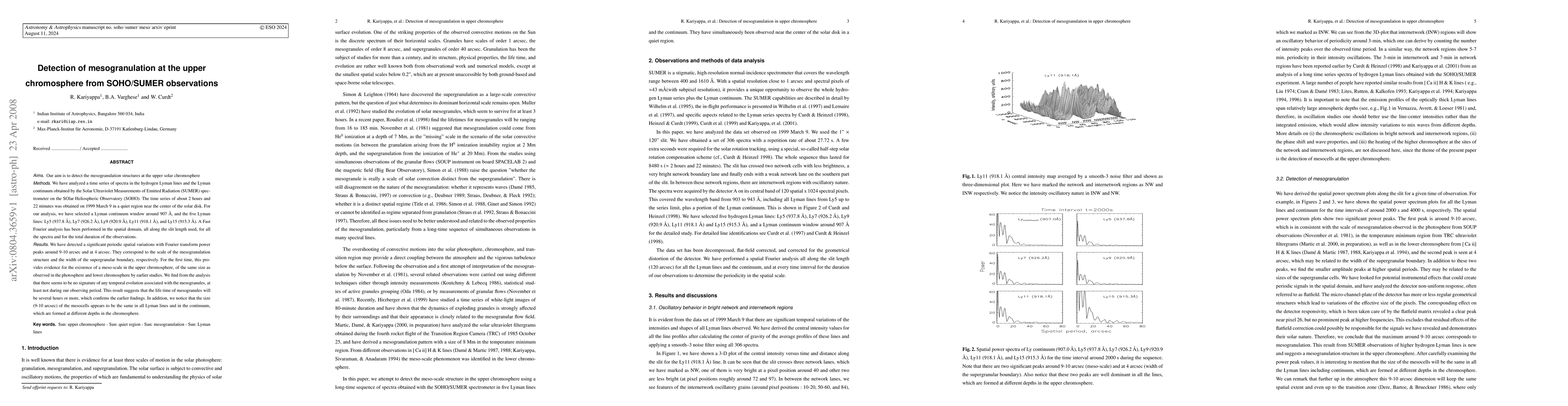 This study detected mesogranulation structures in the upper chromosphere using SOHO/SUMER spectra, revealing periodic spatial variations corresponding to mesogranules of 9-10 arcsec. The analysis indicates no significant temporal evolution, suggesting mesogranules have lifetimes of several hours or more.