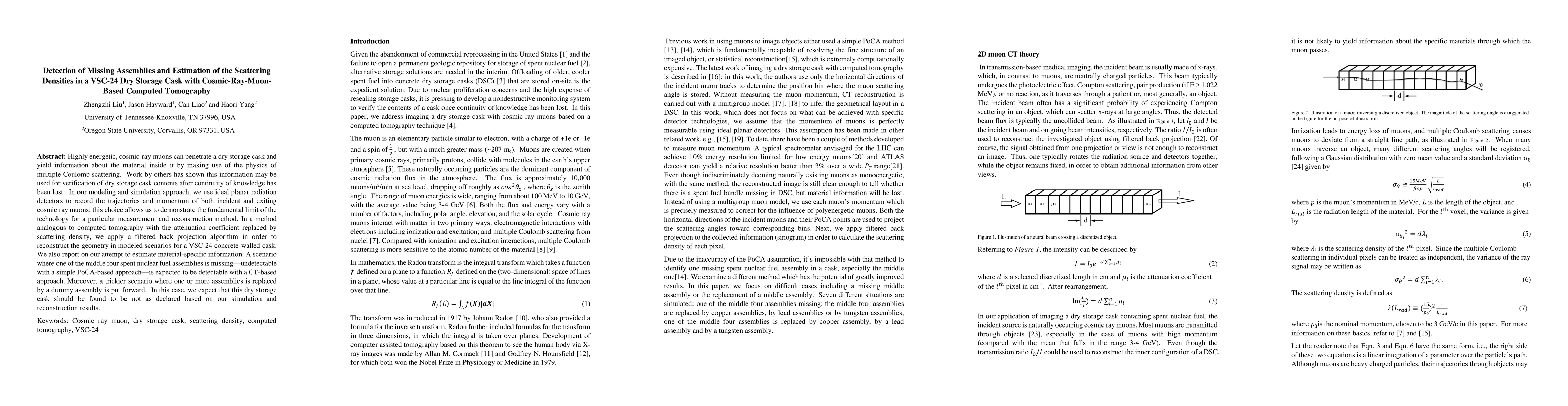 This paper explores the use of cosmic-ray muons for detecting missing assemblies and estimating scattering densities in a VSC-24 dry storage cask via a muon-based computed tomography method. The study demonstrates the feasibility of identifying missing or substituted assemblies using a filtered back projection algorithm, and estimates material composition based on precise muon momentum measurements.