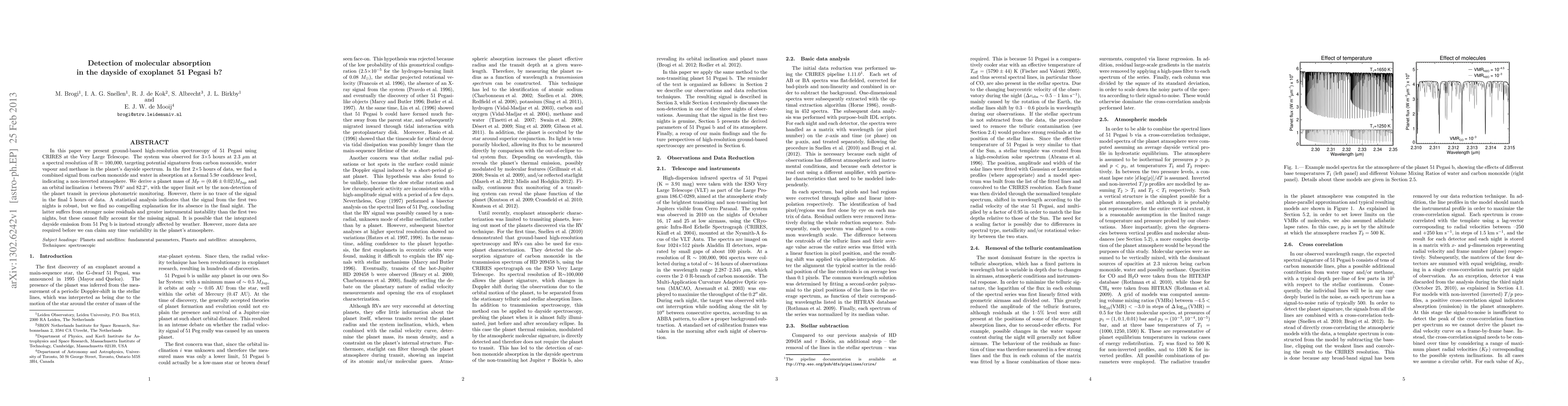 In this paper we present ground-based high-resolution spectroscopy of 51 Pegasi using CRIRES at the Very Large Telescope. The system was observed for 3x5 hours at 2.3 {\mu}m at a spectral resolution of R = 100,000, targeting potential signatures from carbon monoxide, water vapour and methane in the planet's dayside spectrum. In the first 2x5 hours of data, we find a combined signal from carbon monoxide and water in absorption at a formal 5.9{\sigma} confidence level, indicating a non-inverted atmosphere. We derive a planet mass of M_P = (0.46 +- 0.02) M_Jup and an orbital inclination i between 79.6 and 82.2 degrees, with the upper limit set by the non-detection of the planet transit in previous photometric monitoring. However, there is no trace of the signal in the final 5 hours of data. A statistical analysis indicates that the signal from the first two nights is robust, but we find no compelling explanation for its absence in the final night. The latter suffers from stronger noise residuals and greater instrumental instability than the first two nights, but these cannot fully account for the missing signal. It is possible that the integrated dayside emission from 51 Peg b is instead strongly affected by weather. However, more data are required before we can claim any time variability in the planet's atmosphere.