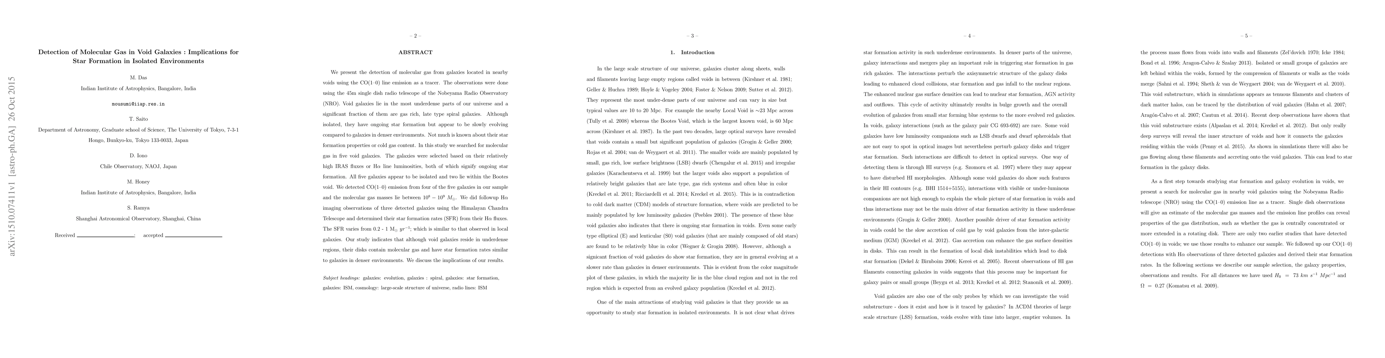This study detected molecular gas in five void galaxies using CO line emission, revealing ongoing star formation despite their isolated environments. The galaxies show star formation rates comparable to those in denser regions, indicating that void galaxies maintain similar star formation properties despite their sparse surroundings.