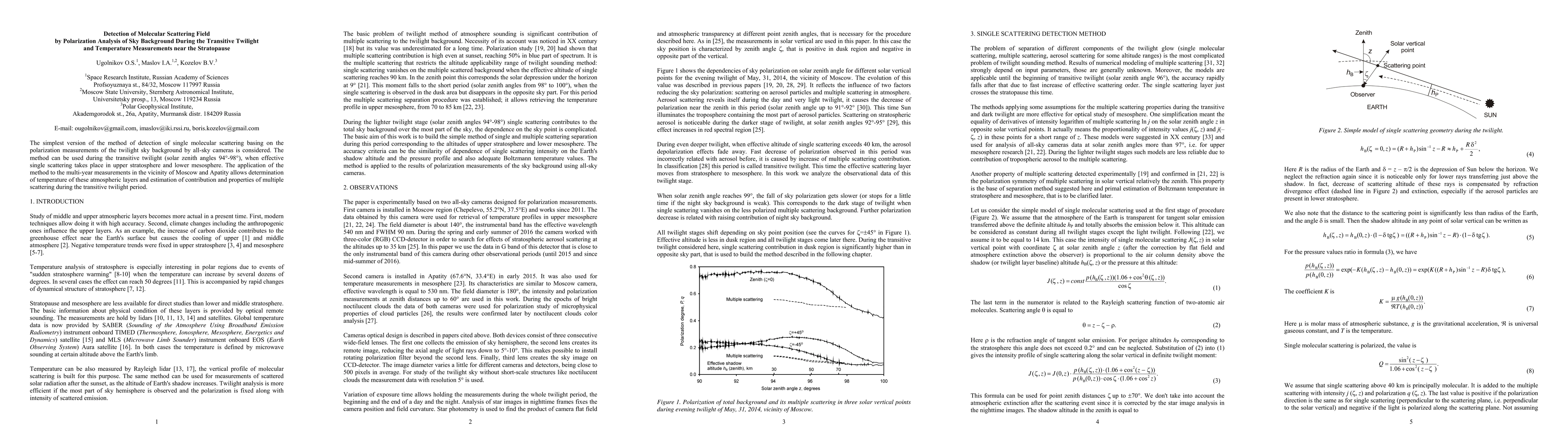 This paper proposes a method for detecting molecular scattering fields using polarization analysis of the twilight sky, which can determine atmospheric temperatures in the upper stratosphere and lower mesosphere during transitive twilight. The method's effectiveness is demonstrated through multi-year measurements near Moscow and Apatity, providing insights into multiple scattering properties.