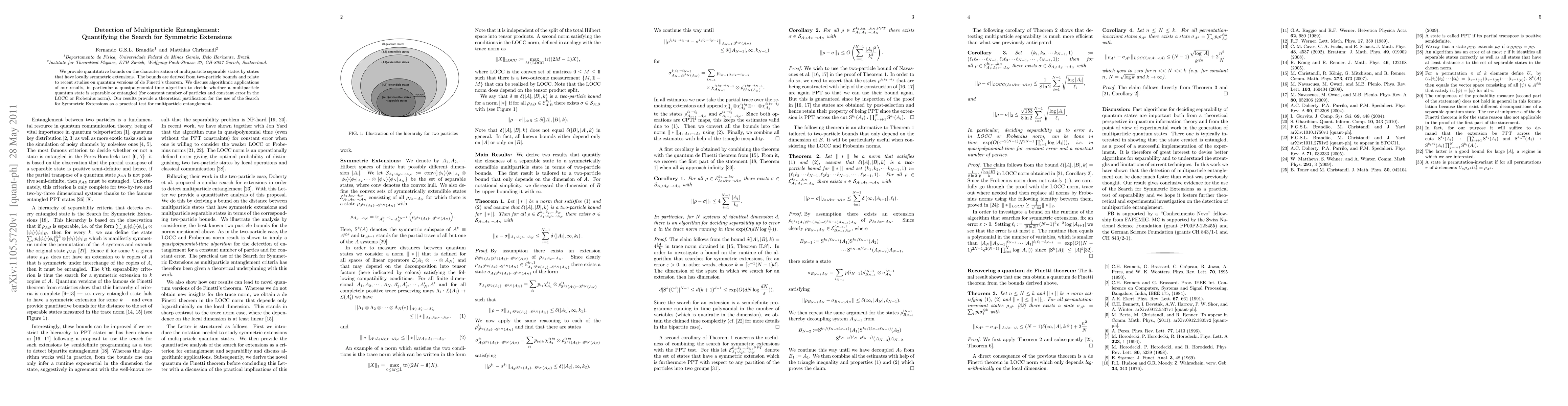 We provide quantitative bounds on the characterisation of multiparticle separable states by states that have locally symmetric extensions. The bounds are derived from two-particle bounds and relate to recent studies on quantum versions of de Finetti's theorem. We discuss algorithmic applications of our results, in particular a quasipolynomial-time algorithm to decide whether a multiparticle quantum state is separable or entangled (for constant number of particles and constant error in the LOCC or Frobenius norm). Our results provide a theoretical justification for the use of the Search for Symmetric Extensions as a practical test for multiparticle entanglement.