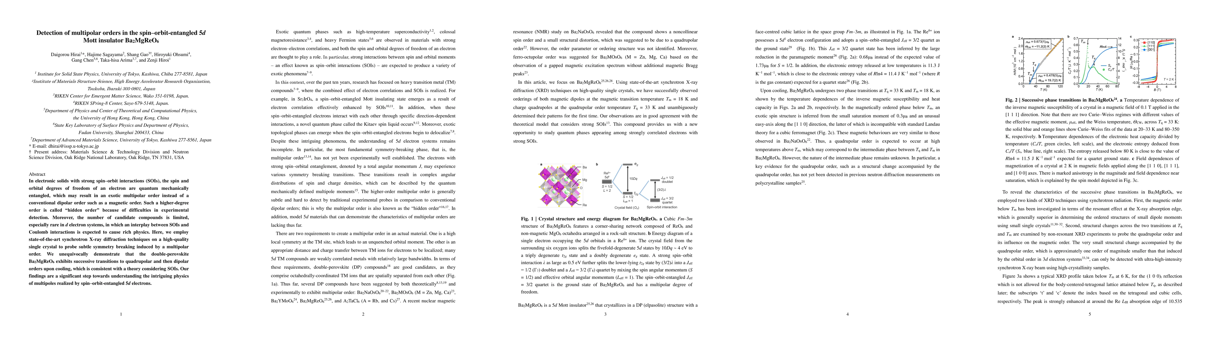 The study employs advanced synchrotron X-ray diffraction to detect multipolar orders in the spin-orbit-entangled 5d Mott insulator Ba2MgReO6, revealing transitions to quadrupolar and dipolar orders upon cooling, thus contributing to understanding the physics of spin-orbit entangled electrons.