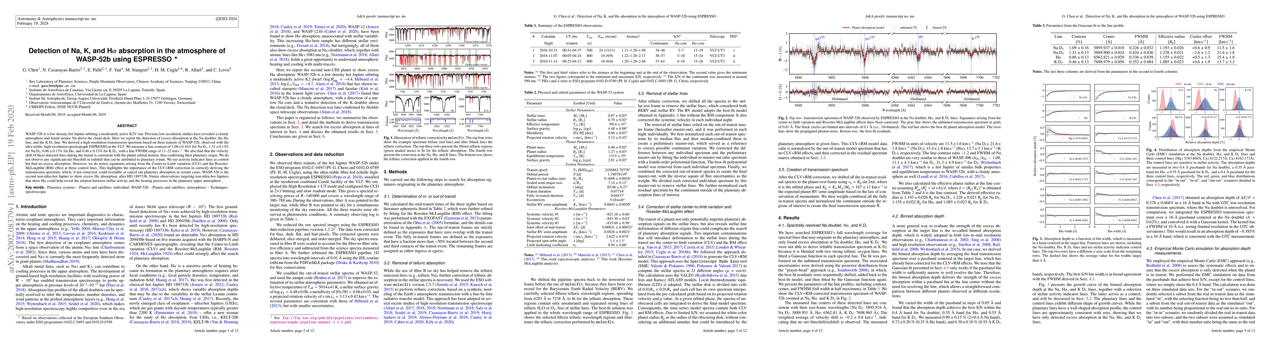 WASP-52b is a low density hot Jupiter orbiting a moderately active K2V star. Previous low-resolution studies have revealed a cloudy atmosphere and found atomic Na above the cloud deck. Here we report the detection of excess absorption at the Na doublet, the H$\alpha$ line, and the K D$_1$ line. We derived a high-resolution transmission spectrum based on three transits of WASP-52b, observed with the ultra stable, high-resolution spectrograph ESPRESSO at the VLT. We measure a line contrast of $1.09\pm 0.16$% for Na D$_1$, $1.31\pm 0.13$% for Na D$_2$, $0.86\pm 0.13$% for H$\alpha$, and $0.46\pm 0.13$% for K D$_1$, with a line FWHM range of 11-22 km s$^{-1}$. We also find that the velocity shift of these detected lines during the transit is consistent with the planet orbital motion, thus confirming their planetary origin. We do not observe any significant net blueshift or redshift that can be attributed to planetary winds. We use activity indicator lines as control but find no excess absorption. However, we do notice signatures arising from the Center-to-Limb variation (CLV) and the Rossiter-McLaughlin (RM) effect at these control lines. This highlights the importance of the CLV+RM correction in correctly deriving the transmission spectrum, which, if not corrected, could resemble or cancel out planetary absorption in certain cases. WASP-52b is the second non-ultra-hot Jupiter to show excess H$\alpha$ absorption, after HD 189733b. Future observations targeting non-ultra-hot Jupiters that show H$\alpha$ could help reveal the relation between stellar activity and the heating processes in the planetary upper atmosphere.