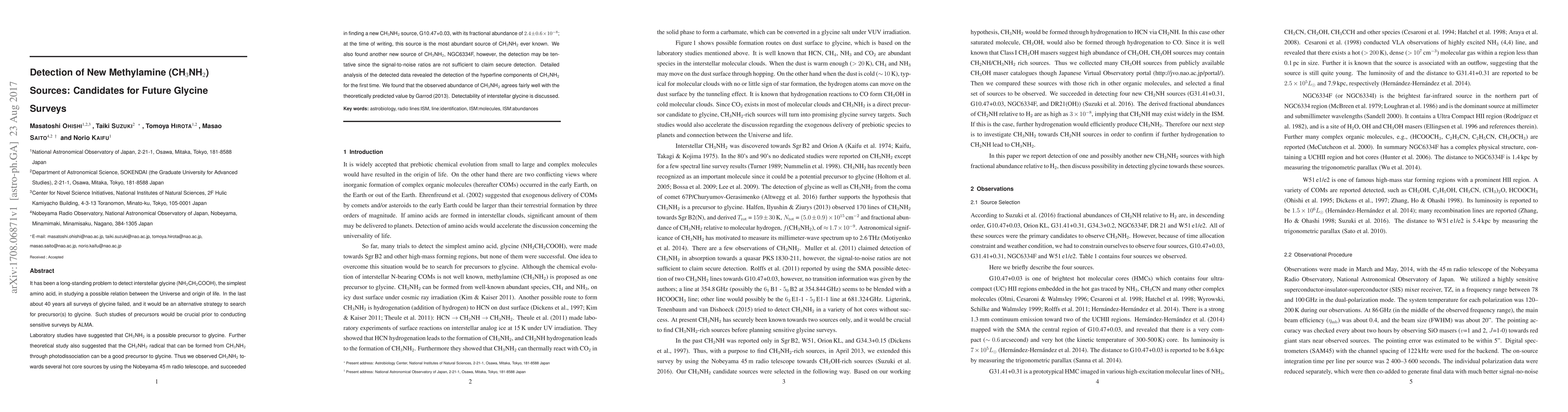 Researchers have identified a new, abundant source of methylamine (CH$_3$NH$_2$) in space, G10.47+0.03, using the Nobeyama 45m radio telescope. This discovery, alongside a potential detection in NGC6334F, supports the hypothesis that CH$_3$NH$_2$ could be a precursor to glycine, aiding future glycine surveys and offering insights into interstellar chemistry.