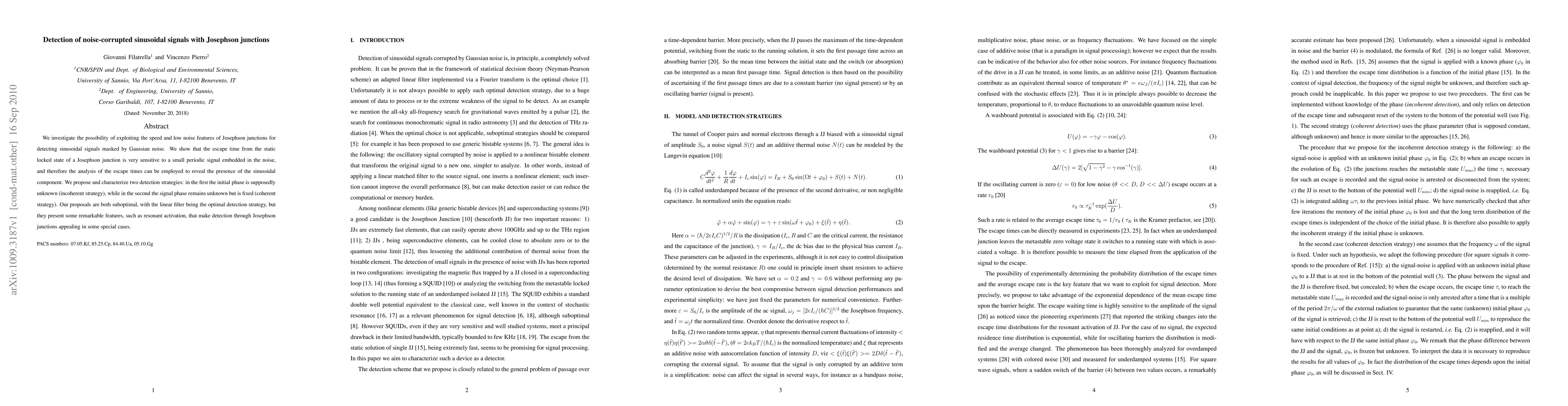 This paper explores using Josephson junctions to detect sinusoidal signals obscured by Gaussian noise, leveraging the junctions' speed and low noise. It proposes two detection strategies—incoherent and coherent—that reveal the presence of sinusoidal components through escape time analysis, highlighting their unique features despite being suboptimal compared to the optimal linear filter.