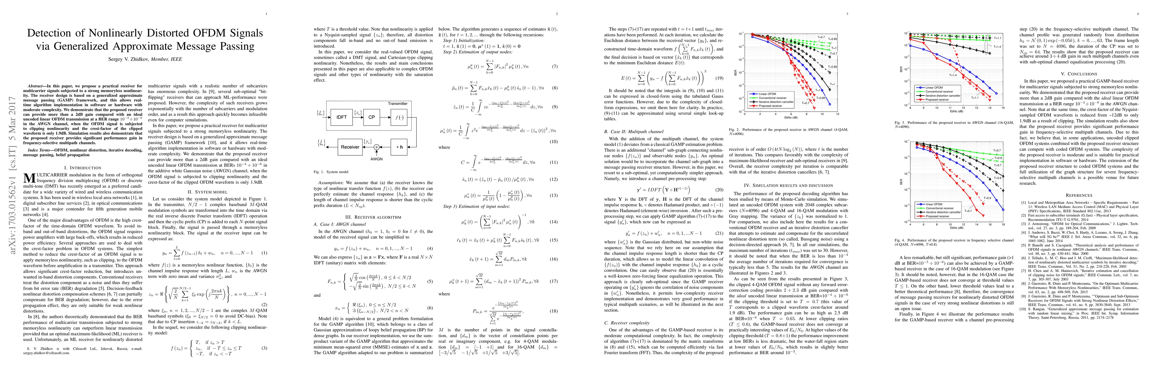 This paper proposes a practical receiver for nonlinearly distorted OFDM signals using a generalized approximate message passing framework, achieving over 2dB gain compared to linear transmission in both AWGN and multipath channels. The method allows real-time implementation with moderate complexity.
