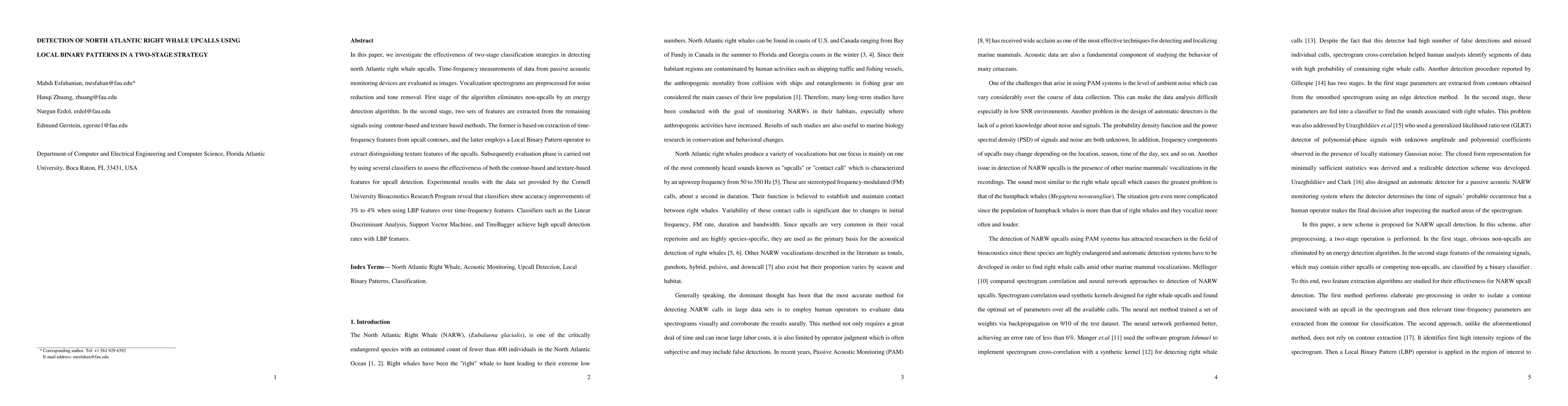 This paper proposes a two-stage classification strategy for detecting North Atlantic right whale upcalls using passive acoustic monitoring. The method employs Local Binary Patterns (LBP) for texture feature extraction, showing a 3% to 4% accuracy improvement over time-frequency features, with classifiers like Linear Discriminant Analysis and Support Vector Machine achieving high detection rates.