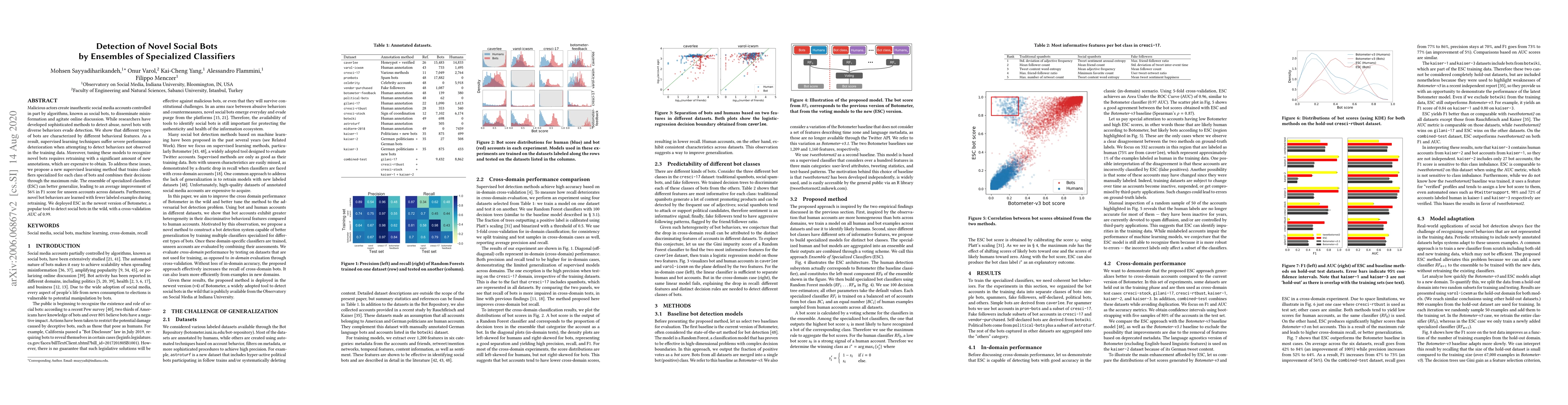 This paper proposes an ensemble of specialized classifiers (ESC) to detect novel social bots, which outperforms traditional methods by training distinct classifiers for different bot types and combining their decisions. The ESC approach achieves a 56% improvement in F1 score for detecting unseen accounts and requires fewer labeled examples for retraining.
