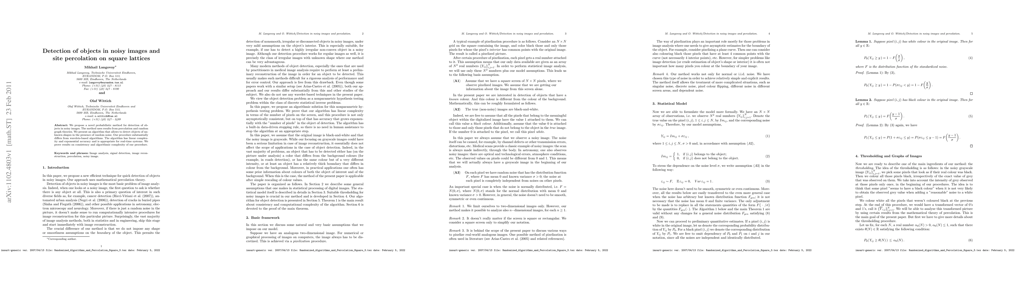 We propose a novel probabilistic method for detection of objects in noisy images. The method uses results from percolation and random graph theories. We present an algorithm that allows to detect objects of unknown shapes in the presence of random noise. Our procedure substantially differs from wavelets-based algorithms. The algorithm has linear complexity and exponential accuracy and is appropriate for real-time systems. We prove results on consistency and algorithmic complexity of our procedure.