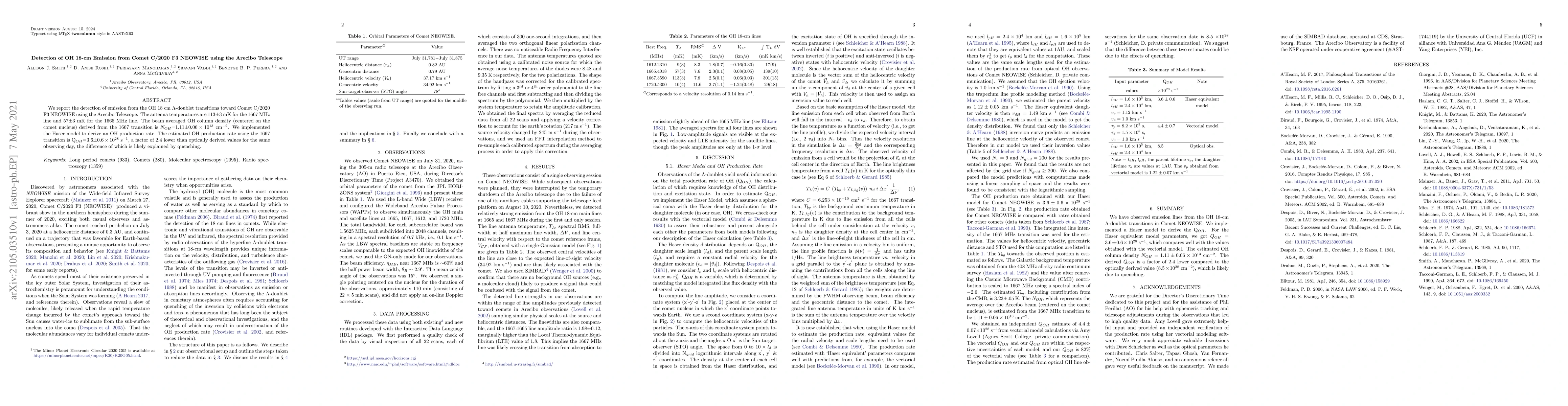 We report the detection of emission from the OH 18 cm $\Lambda$-doublet transitions toward Comet C/2020 F3 NEOWISE using the Arecibo Telescope. The antenna temperatures are 113$\pm$3 mK for the 1667 MHz line and 57$\pm$3 mK for the 1665 MHz line. The beam averaged OH column density (centered on the comet nucleus) derived from the 1667 transition is $N_{OH}$=1.11$\pm0.06\times10^{13}$ cm$^{-2}$. We implemented the Haser model to derive an OH production rate. The estimated OH production rate using the 1667 MHz transition is Q$_{OH}$=3.6$\pm0.6\times10^{28}$ s$^{-1}$, a factor of 2.4 lower than optically derived values for the same observing day, the difference of which is likely explained by quenching.