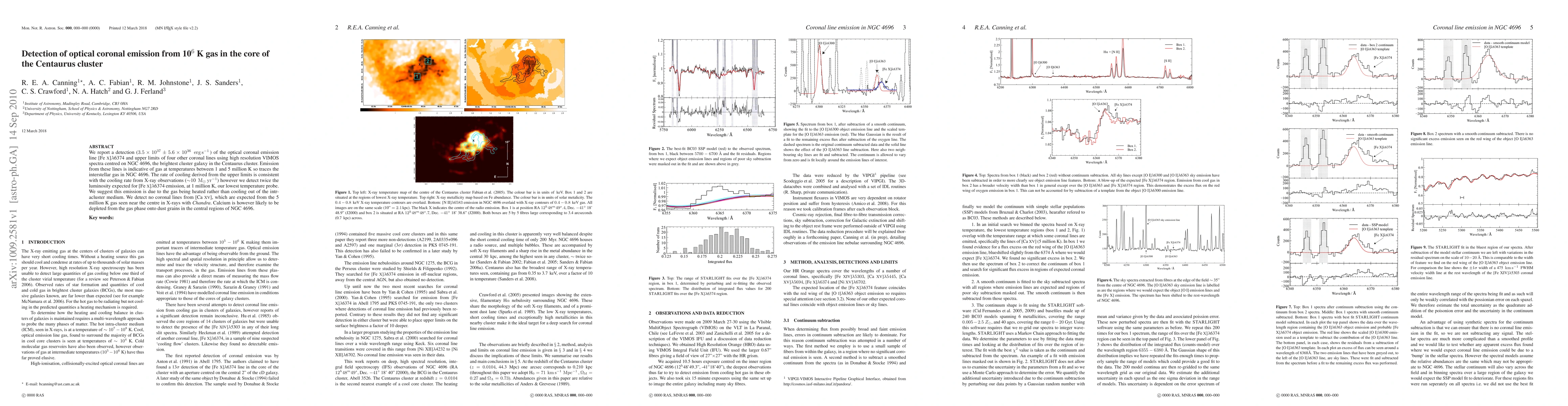 The research utilized high-resolution VIMOS spectra centered on NGC 4696, the brightest cluster galaxy in the Centaurus cluster, to detect and analyze optical coronal emission lines from gas at temperatures between 1 and 5 million K.