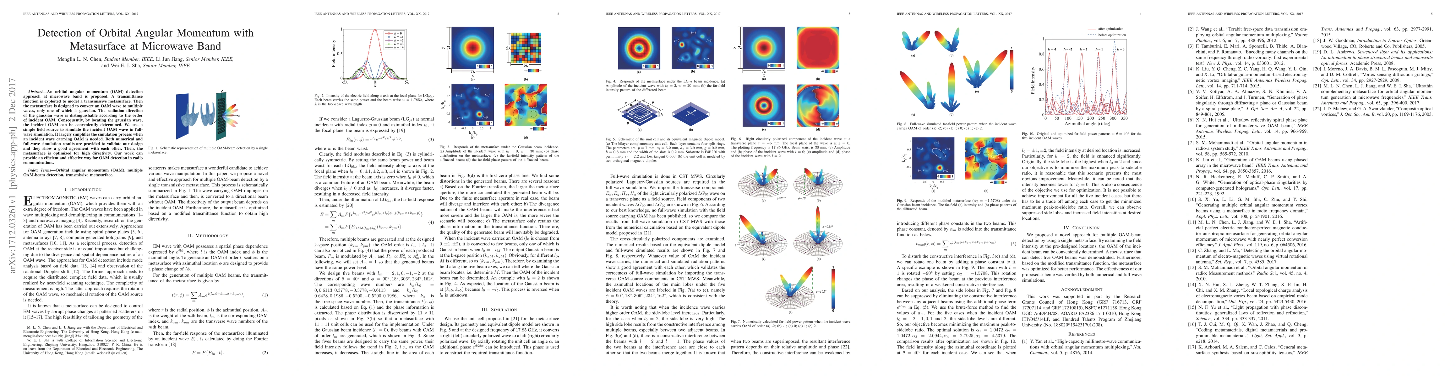 An orbital angular momentum (OAM) detection approach at microwave band is proposed. A transmittance function is exploited to model a transmissive metasurface. Then the metasurface is designed to convert an OAM wave to multiple waves, only one of which is gaussian. The radiation direction of the gaussian wave is distinguishable according to the order of incident OAM. Consequently, by locating the gaussian wave, the incident OAM can be conveniently determined. We use a simple field source to simulate the incident OAM wave in fullwave simulation. It largely simplifies the simulation process when an incident wave carrying OAM is needed. Both numerical and full-wave simulation results are provided to validate our design and they show a good agreement with each other. Then, the metasurface is optimized for high directivity. Our work can provide an efficient and effective way for OAM detection in radio communications.