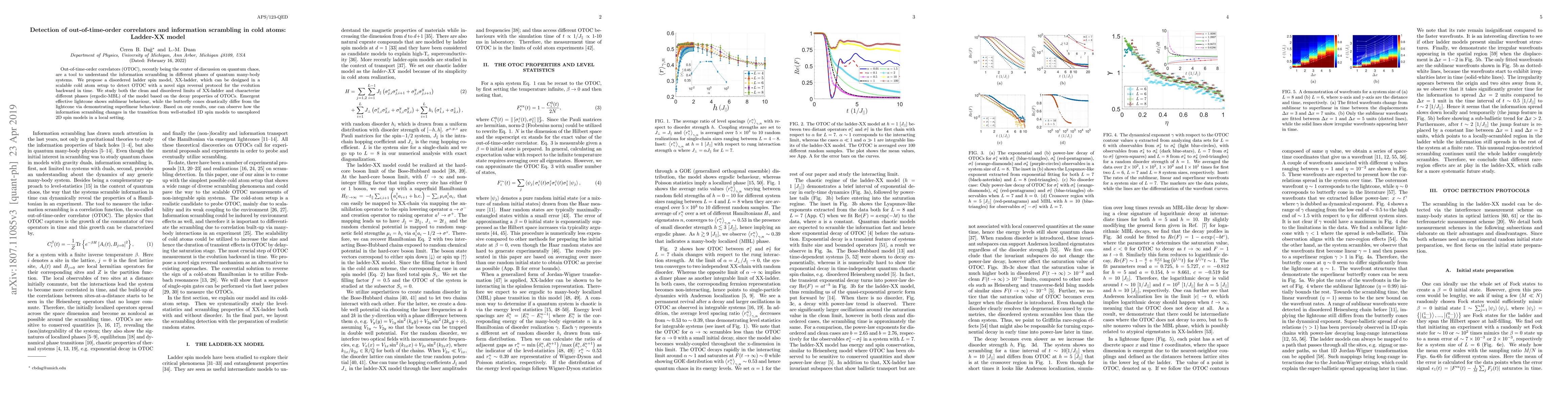 Out-of-time-order correlators (OTOC), recently being the center of discussion on quantum chaos, are a tool to understand the information scrambling in different phases of quantum many-body systems. We propose a disordered ladder spin model, XX-ladder, which can be designed in a scalable cold atom setup to detect OTOC with a novel sign reversal protocol for the evolution backward in time. We study both the clean and disordered limits of XX-ladder and characterize different phases (ergodic-MBL) of the model based on the decay properties of OTOCs. Emergent effective lightcone shows sublinear behaviour, while the butterfly cones drastically differ from the lightcone via demonstrating superlinear behaviour. Based on our results, one can observe how the information scrambling changes in the transition from well-studied 1D spin models to unexplored 2D spin models in a local setting.